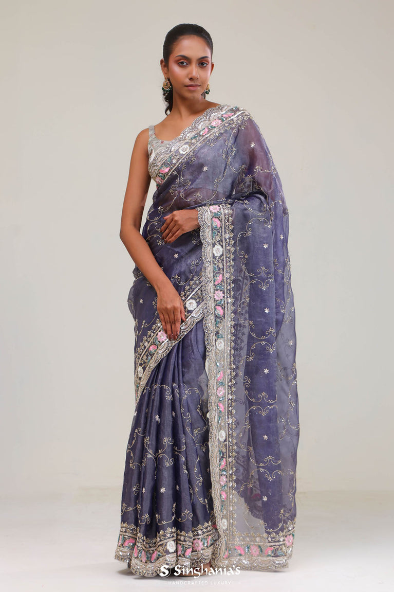 A richly independence blue saree with a tissue base, which features delicate floral jaal on the body. Accentuated with floral embroidery in sequins and glass beads, with scalloped border edge, that adds to the whole look. Suitable for festive and wedding parties.
