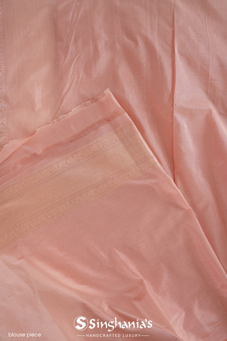 Delicate heather peach banarasi saree is crafted from silk fabric, featuring floral butti patterns with gold accents across the body and small border and pallu with floral-geometric design & self edging. Perfect for festive and wedding occasions.