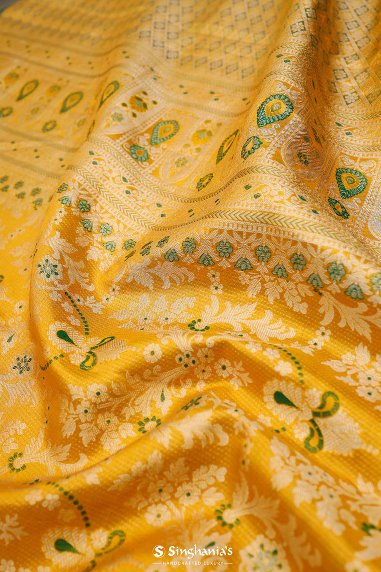 A haldi yellow kanjivaram silk saree adorned with floral jaal weaving in gold-tilfi zari. The contrasting green border and pallu features intricate floral and kaddi design. Beautiful choice for festive celebrations and special events.