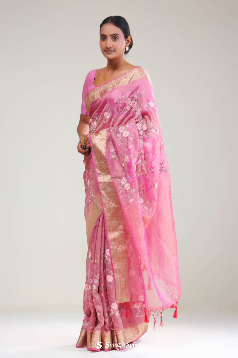 A saree that glows as beautifully as you do! This hot pink saree is woven with fine tissue fabric, creating a radiant shimmer. Accentuated with colourful floral jaal threadwork embroidery and zari border, it’s an excellent choice for festivals, receptions and small celebrations.