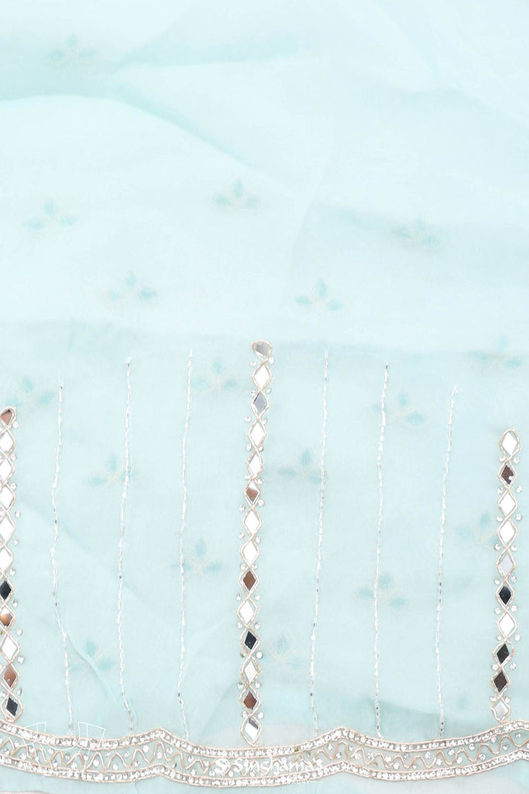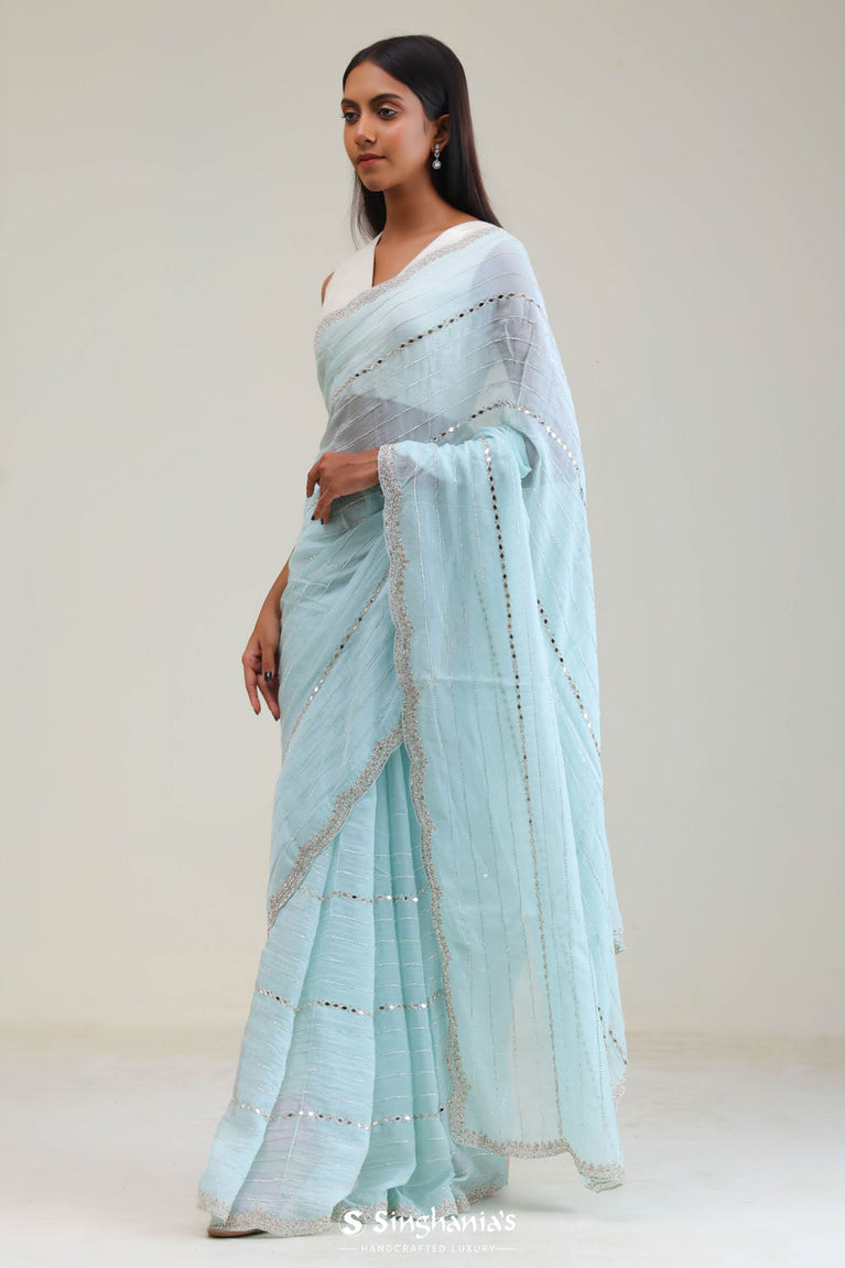 This classic ice blue-coloured saree is made of tissue fabric. It has modern but simple stripe designs embroidered on it with glass beads, stones and mirror work. The big scalloped edge and the neat small border makes it look graceful. It's good for traditional events.