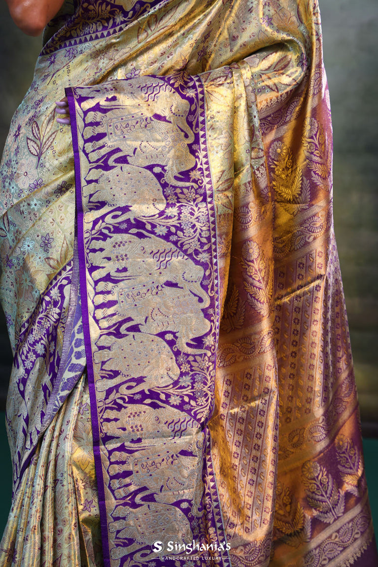 Delicate and precious, this Hansa Yellow Tissue Kanjivaram Saree features multi-geometerical pattern jaal weaving in gold zari. The contrasting gold big border with floral and diamond pattern elevates the look. Drape it for festive and wedding occasions.