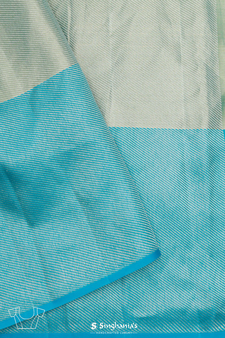 A beautiful kanjivaram silk saree in tiffany blue showcasing butta with diagonal stripes jaal in silver zari all over the body. The big, contrasting blue border & pallu features traditional arrangement of floral-geometrical motifs. A perfect choice for wedding receptions and festive occasions.