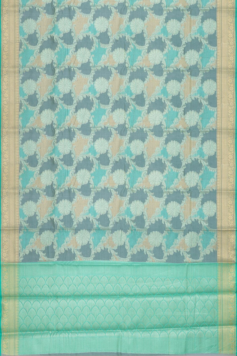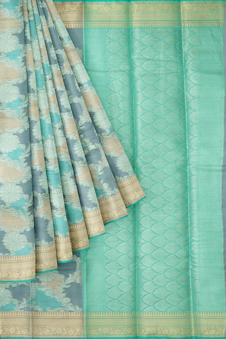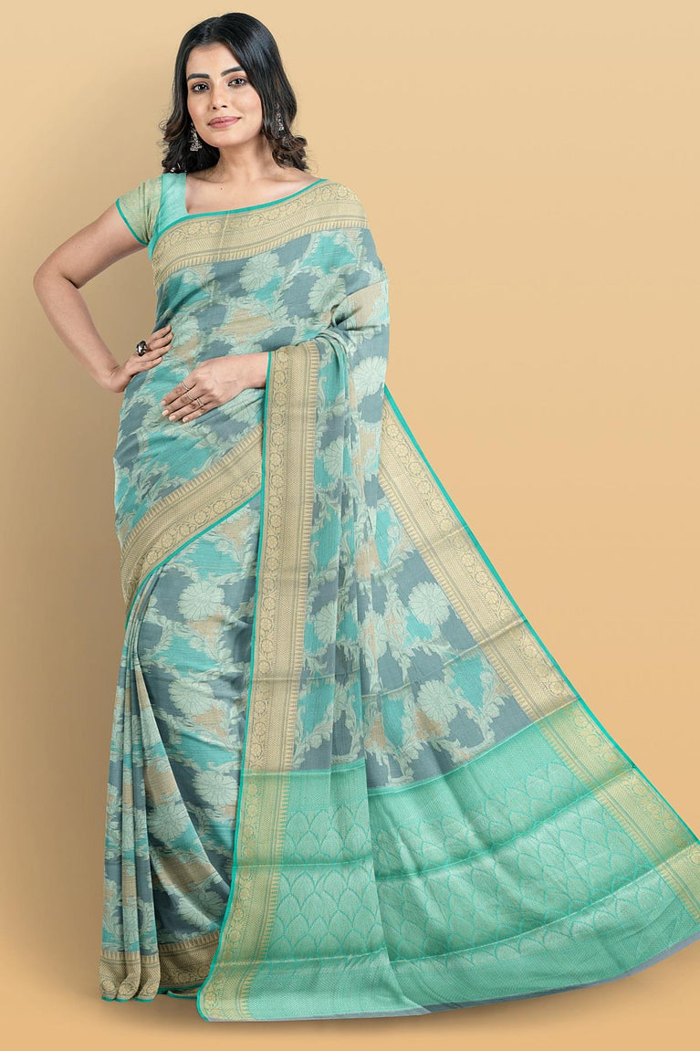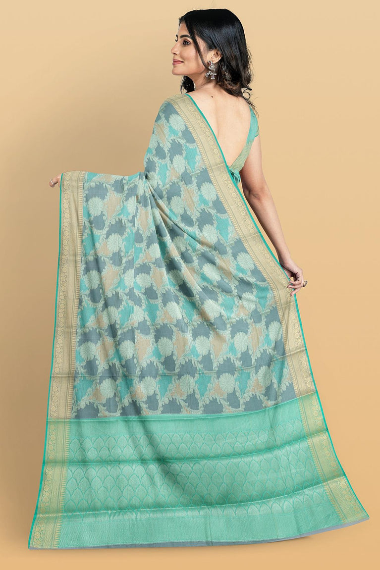 GREY and SEA GREEN FLORAL JAAL SILK Saree with FANCY