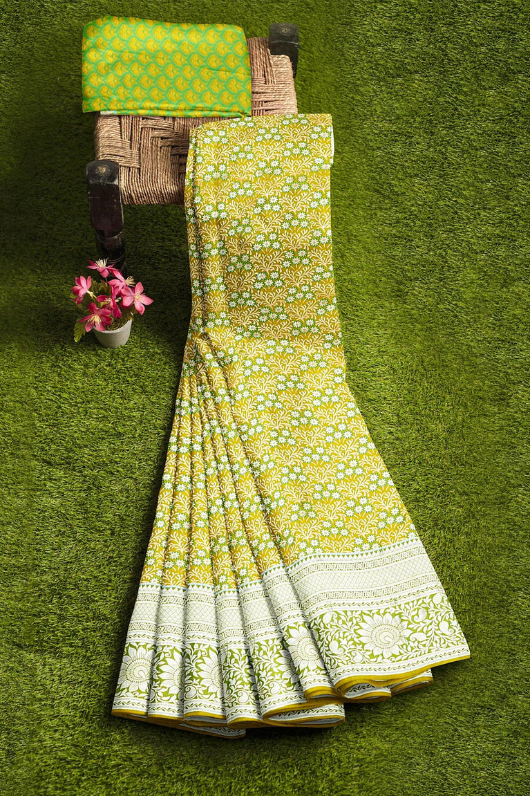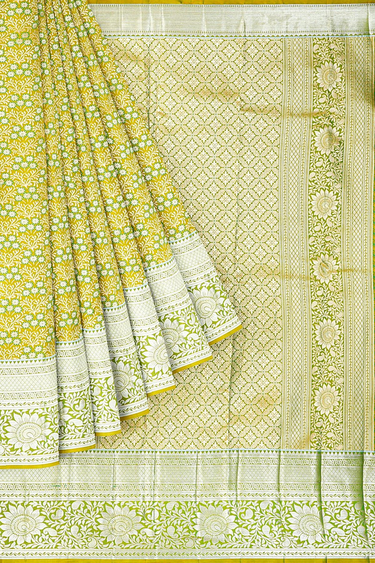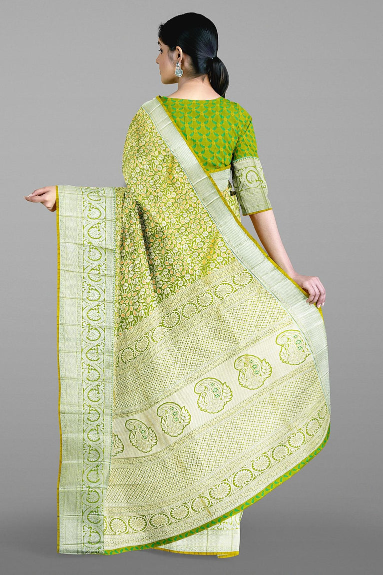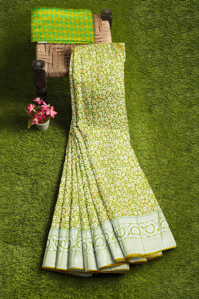 LIGHT OLIVE GREEN and SILVER FLORAL JAAL CHIFFON Saree with BANARASI FANCY