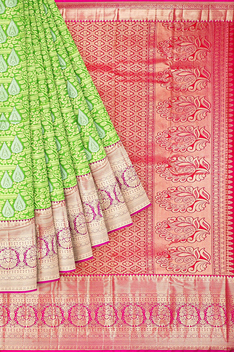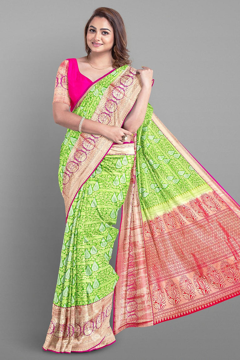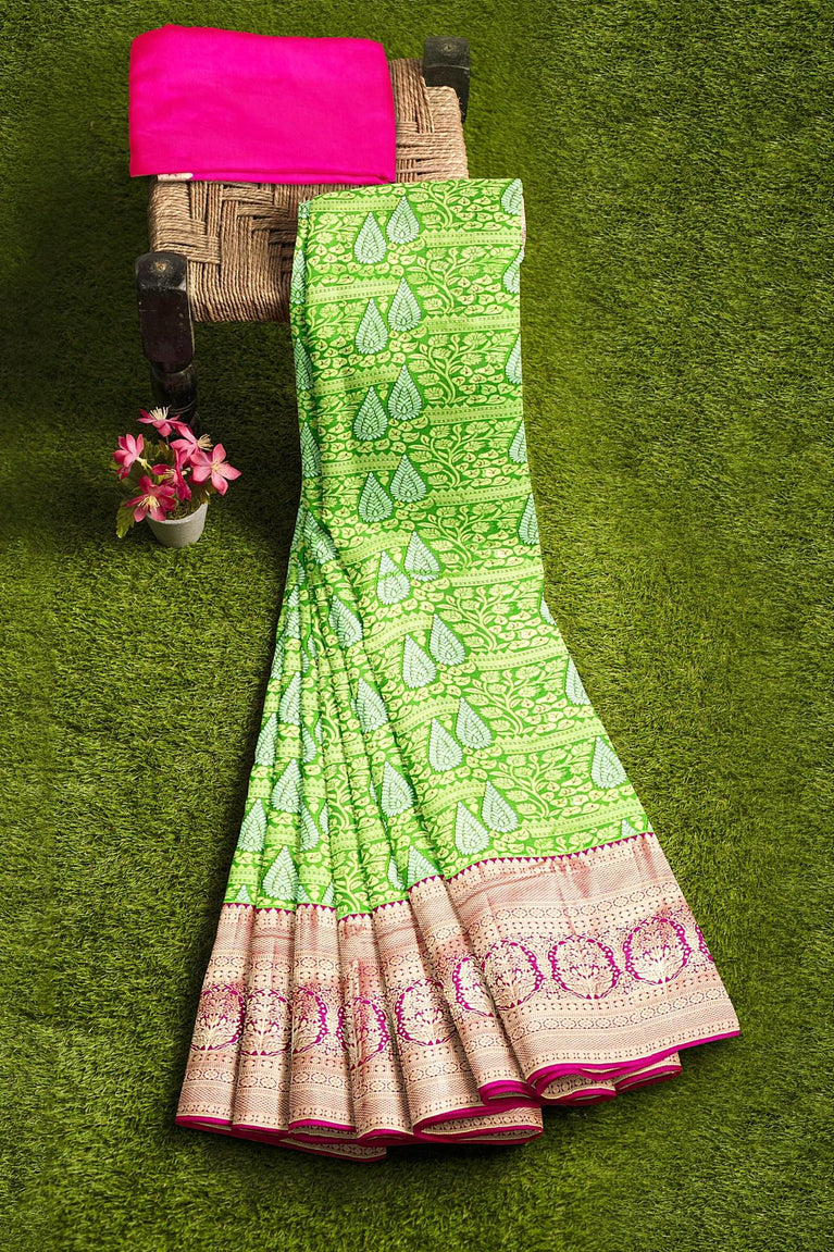 LIGHT GREEN and PINK FLORAL JAAL SILK BLEND Saree with SEMI PATTU