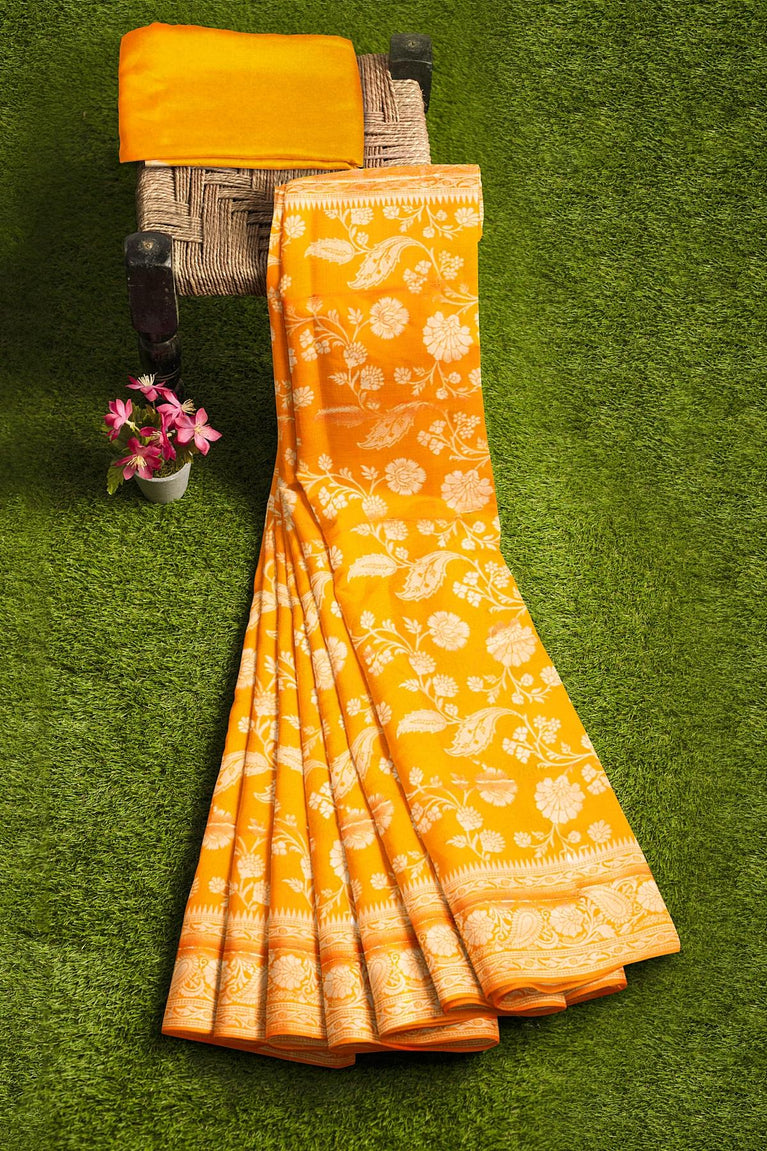 YELLOW and GOLD FLORALS SILK BLEND Saree with SEMI PATTU