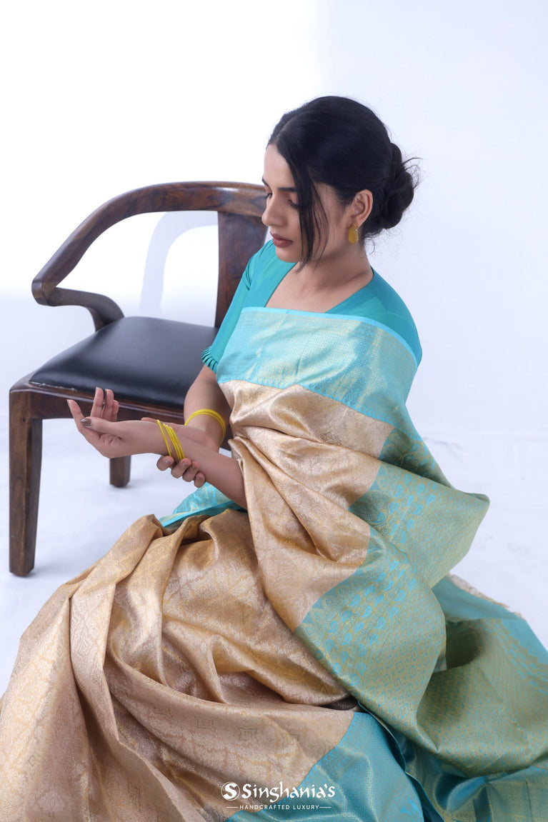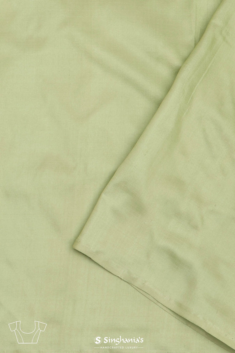 A soothing chinoise green banarasi saree with a satin base, which features palin solid colour on the body. Added with a broad border and pallu, crafted with gold and silver zari weave. Perfect choice for festive wear and weddings.