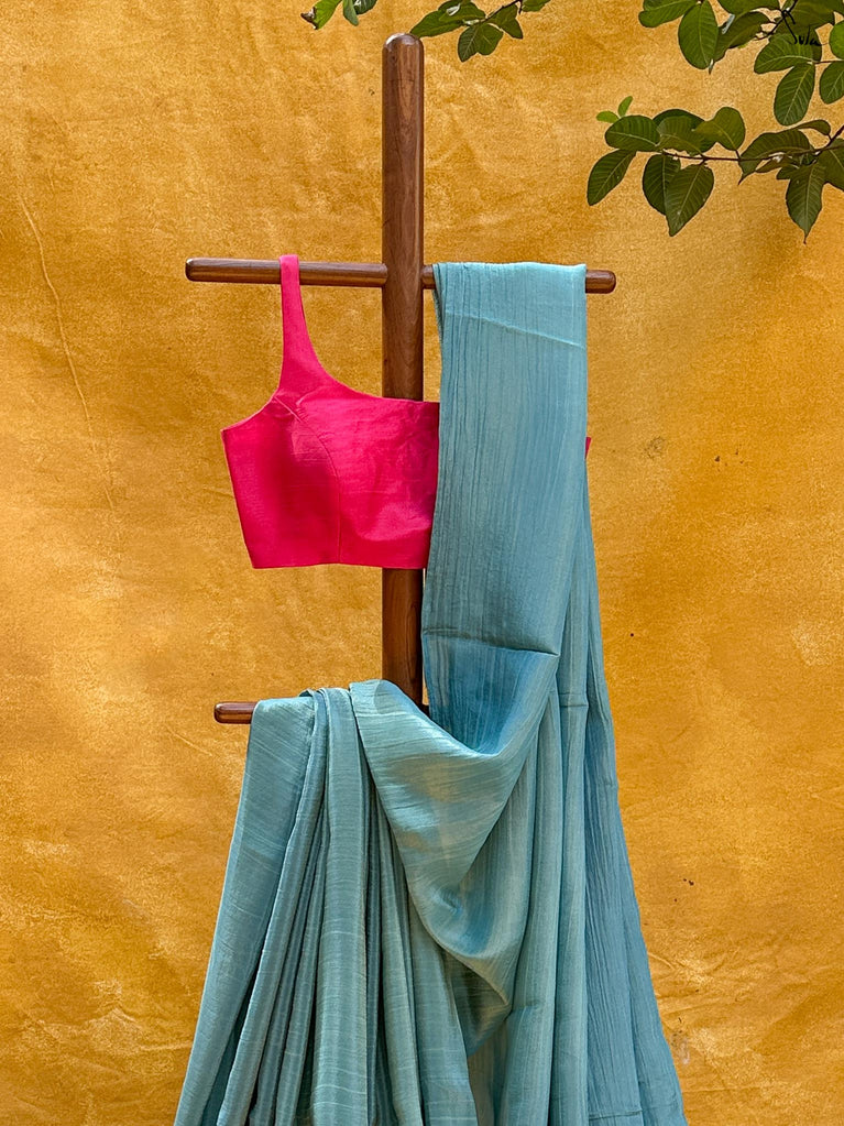 A glass of bold poured into the fabric. This wine crushed viscose saree is rich, moody, and unapologetically dramatic. Contrast tassels and a streak of gota at the border add that intoxicating flash of glam.