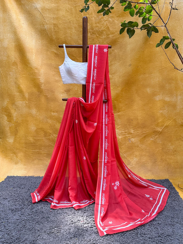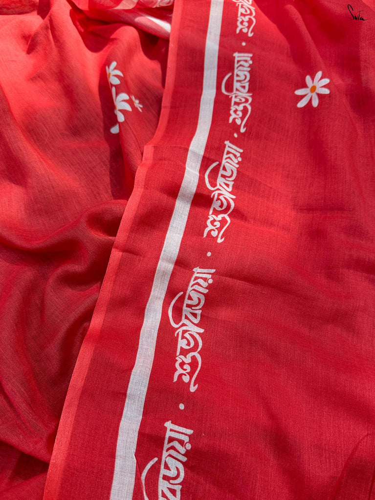 This screen-printed red and white made-in-heaven mul saree is a celebration by itself!