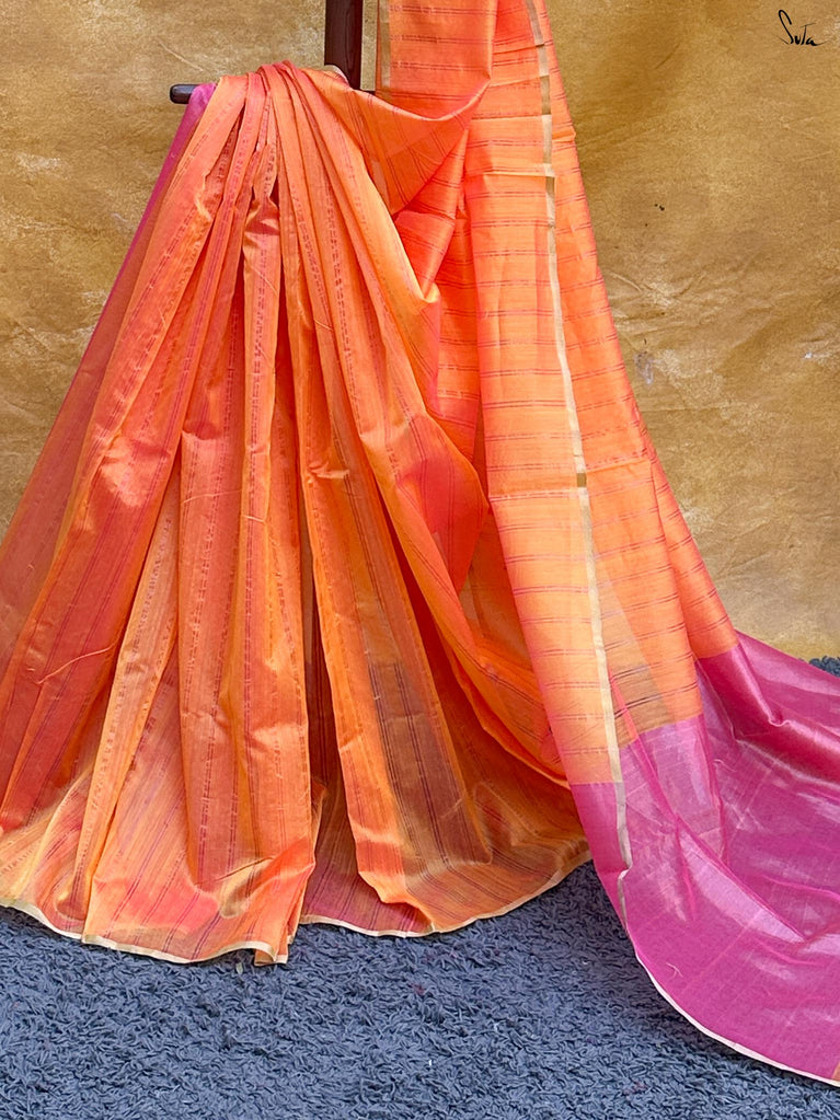 Suta’s ‘made in heaven’ mul cotton is also known as mul mul in West Bengal. The fabric is buttery soft and has a delicate beauty. Its weave is very fine and this lends a very fluid texture to the fabric, which makes draping it a breeze.These sarees are embellished with delicate zari detailing that enhances their elegance and adds a regal charm.