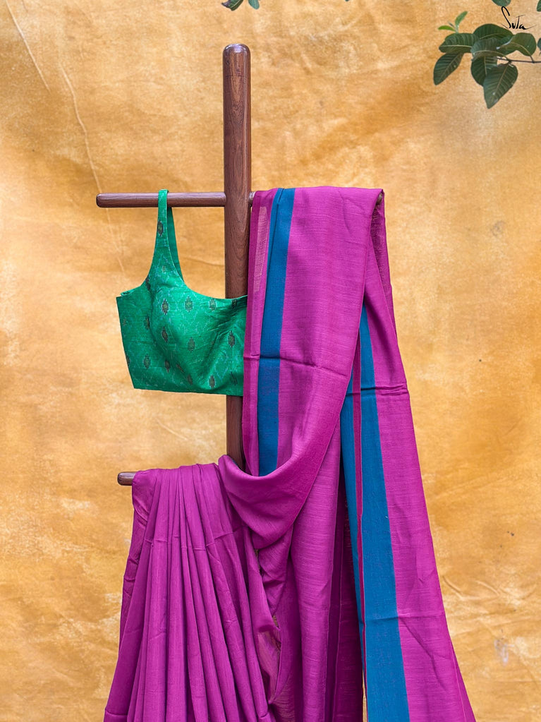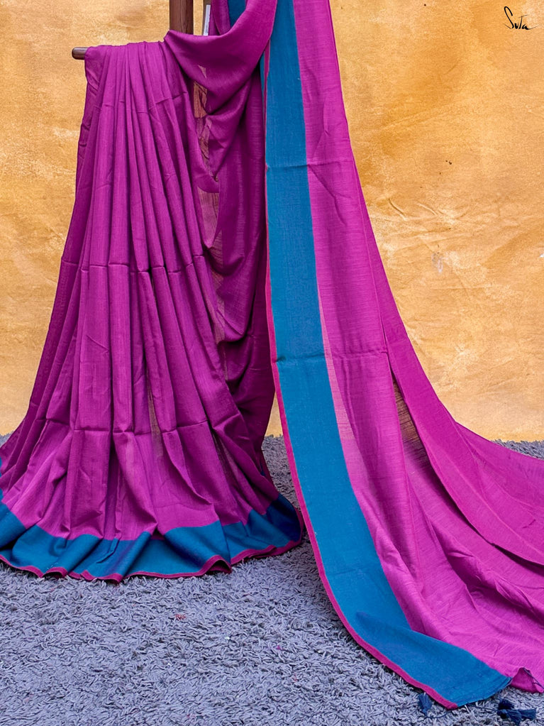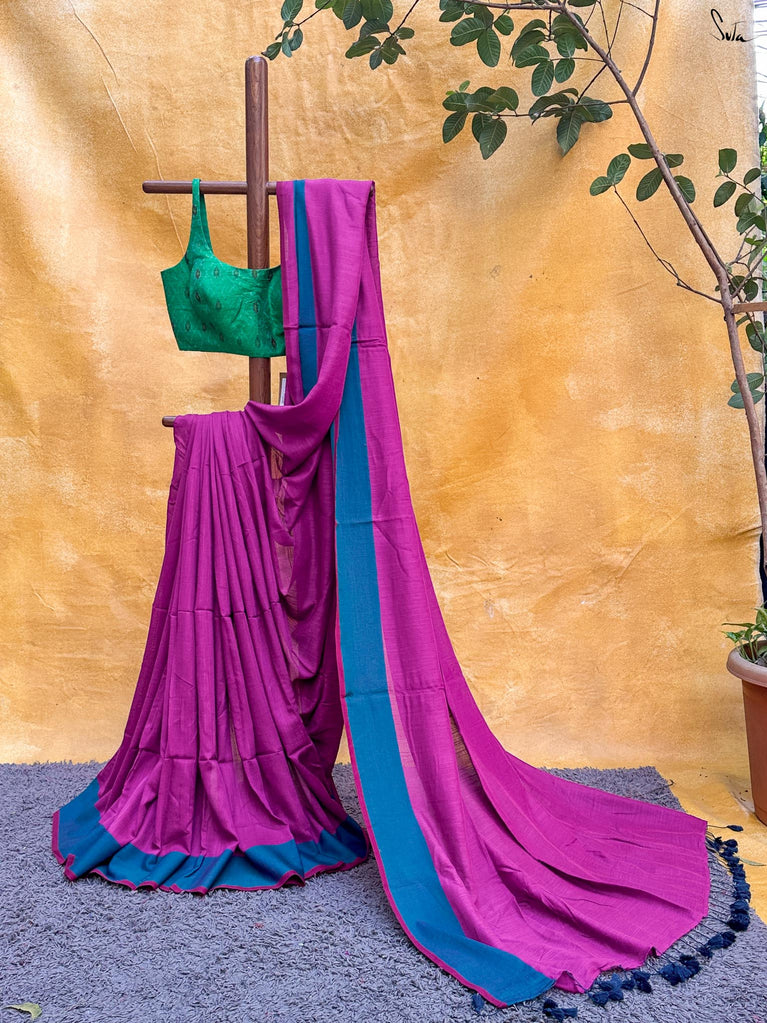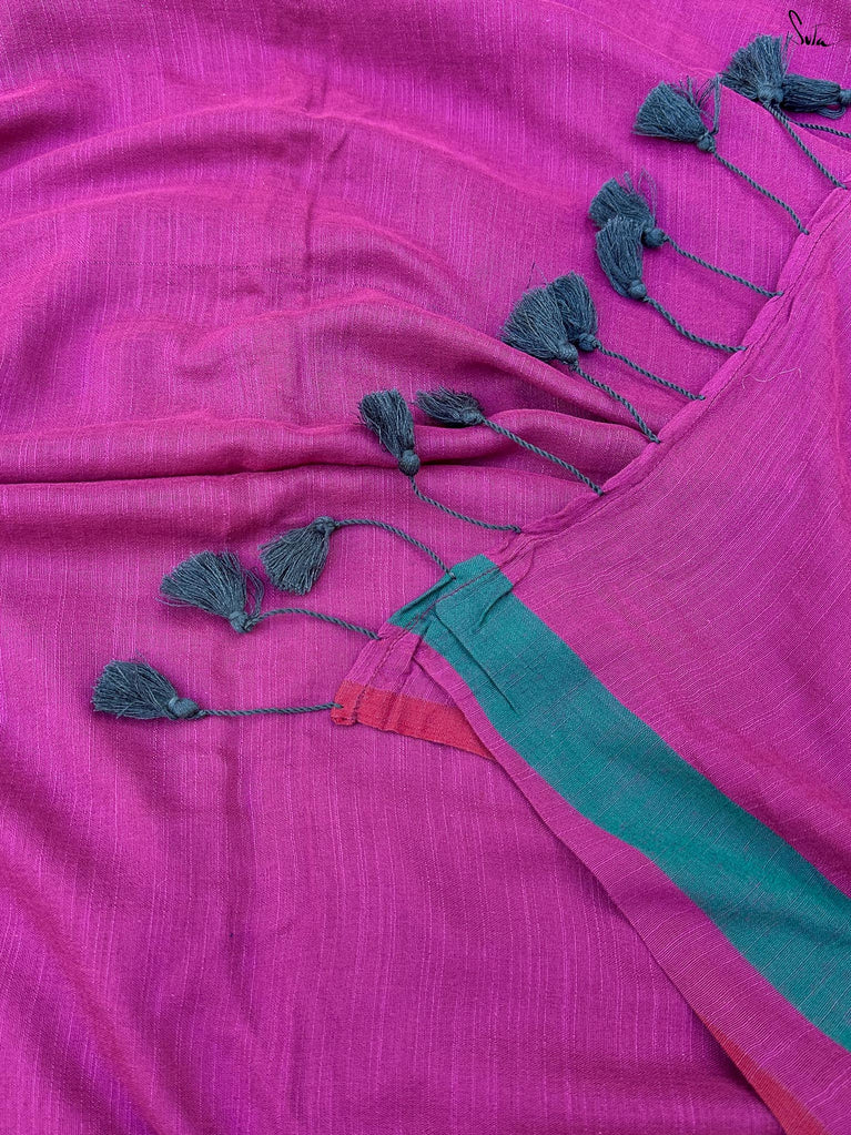 This gorgeous made-in-heaven mul cotton saree in purple with pink tassels and beautiful Ghicha lines on the pallu and zari border is enough in itself to make a stunning statement!