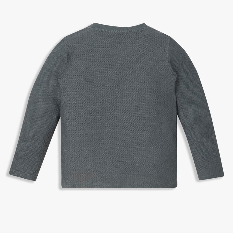 Experience the perfect blend of comfort and style with our Boys Knitted Crew Neck T-Shirt. Crafted from a soft cotton-polyester blend, this t-shirt offers a cozy feel that keeps your little one comfortable all day long. The solid pattern and classic crew neck design make it a versatile addition to any wardrobe, perfect for both casual outings and playtime adventures.