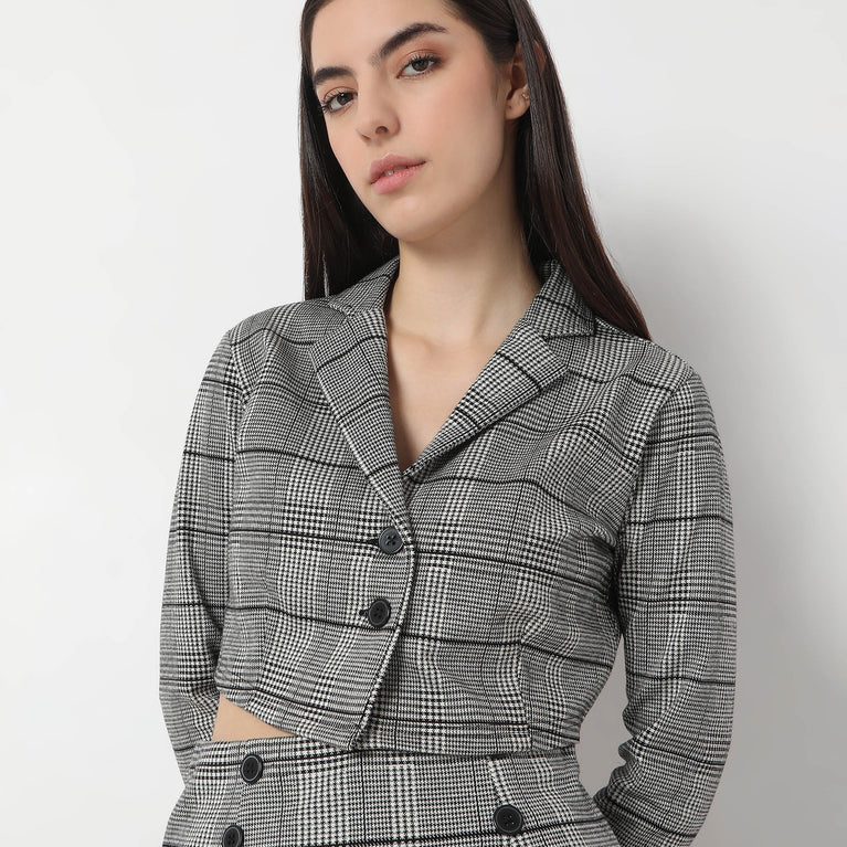 Checkered Lapel Collar Full Sleeve Crop T-Shirt