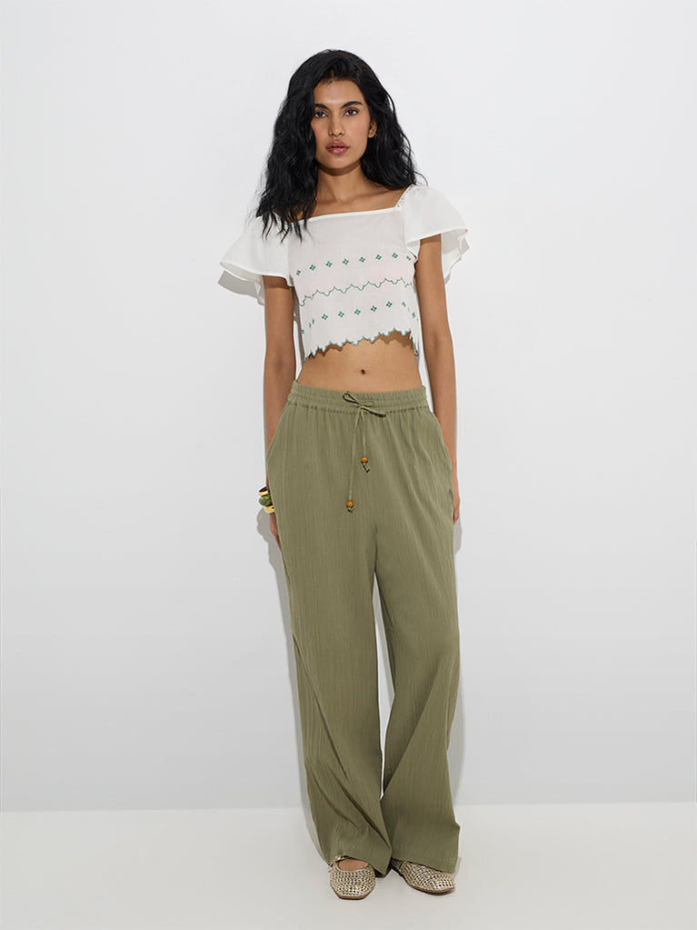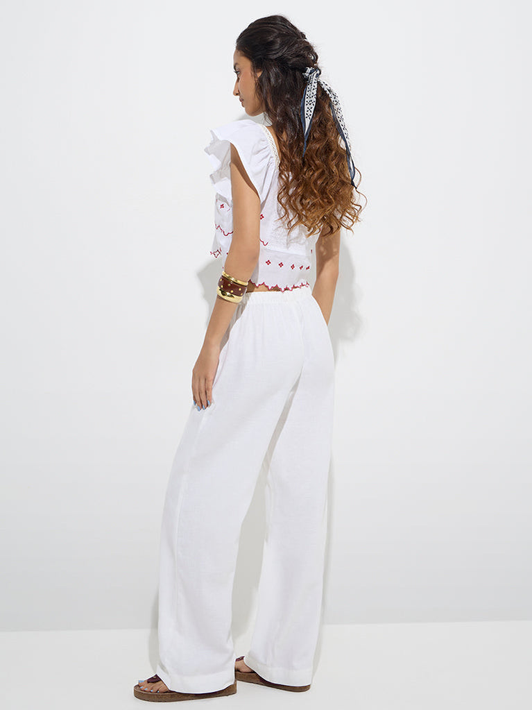 This white top from Bombay Paisley showcases intricate schiffli embroidery on a cotton-rich fabric. Designed with a V-neck adorned with scallop detailing and short sleeves accented with delicate crochet, it radiates a timeless appeal. The elasticated detailing at the waist lends a flattering look.