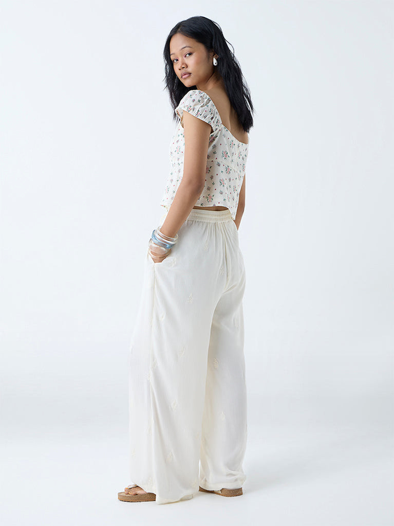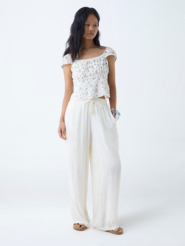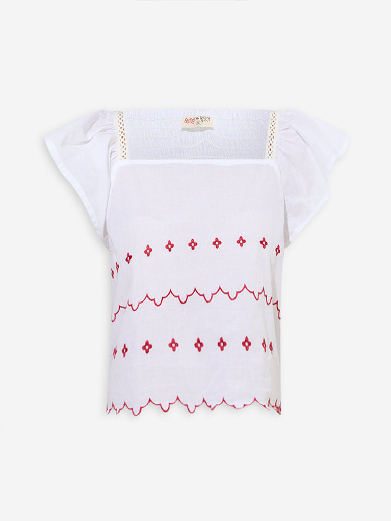 Embrace bohemian elegance with this white top from Bombay Paisley. Beautifully highlighting charming floral motifs, this pure-cotton separate is fitted with a square neck accented with intricate crochet detailing and butterfly sleeves for a touch of romantic flair.