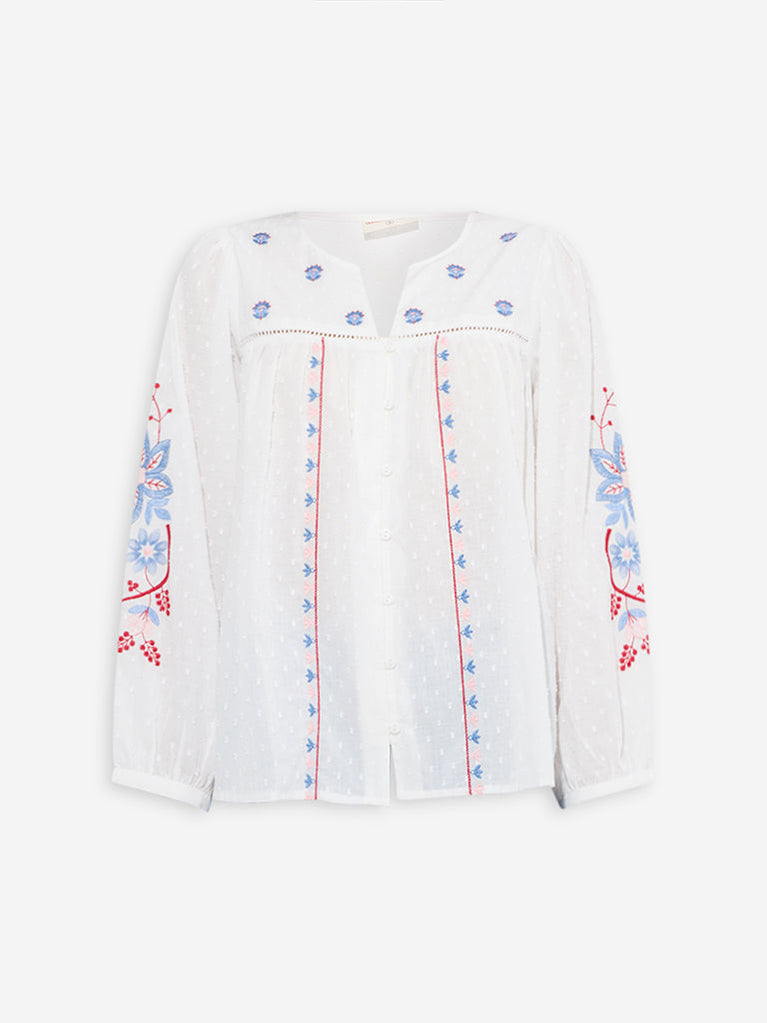 This white blouse from Bombay Paisley is fashioned with floral patterns and swiss dot embroidery that add a touch of timeless elegance. Crafted from pure cotton for elevated comfort, it features a split neck that flows into a neat button placket, while blouson sleeves lend a relaxed yet refined silhouette.