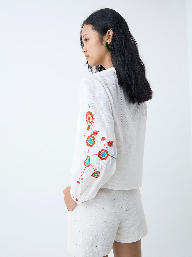 Bombay Paisley White Floral Embroidered Cotton-Blend Top