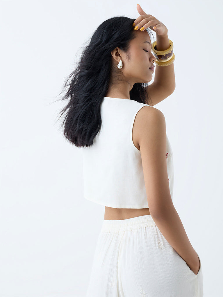 This white waistcoat-style top from Bombay Paisley is detailed with floral embroidery for a touch of artisanal charm. Framed by a V-neck that flows into a buttoned placket, this cotton-rich piece is cut sleeveless, making it a light and breezy choice for warm-weather layering.