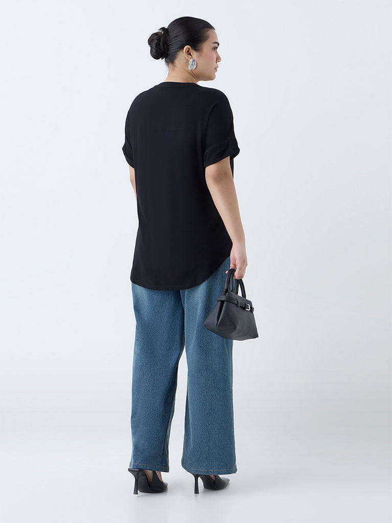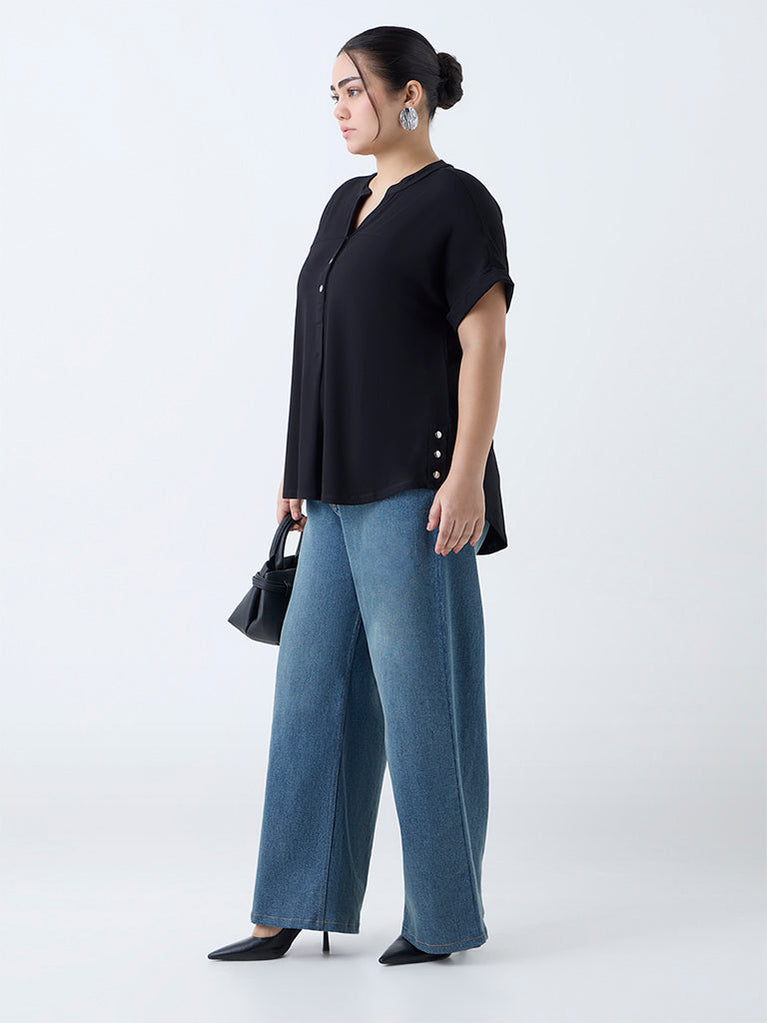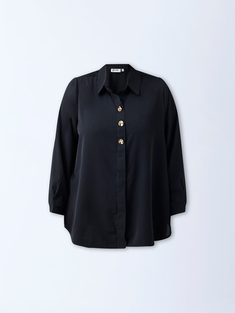 This black blouse from Gia leans into quiet sophistication with its minimal silhouette and luxurious hand feel. Crafted from a sumptuous fabric, it’s detailed with a collar and a gold-toned button placket that adds just the right touch of shine. Finished with full sleeves, it’s the kind of piece that speaks volumes without raising its voice.