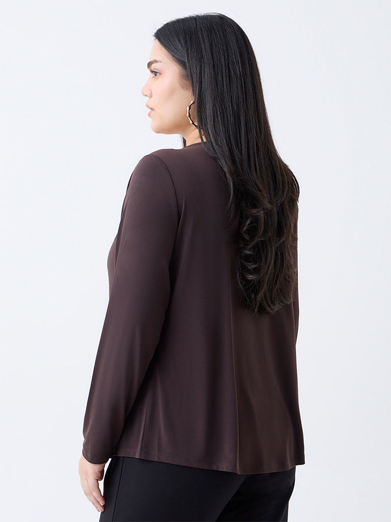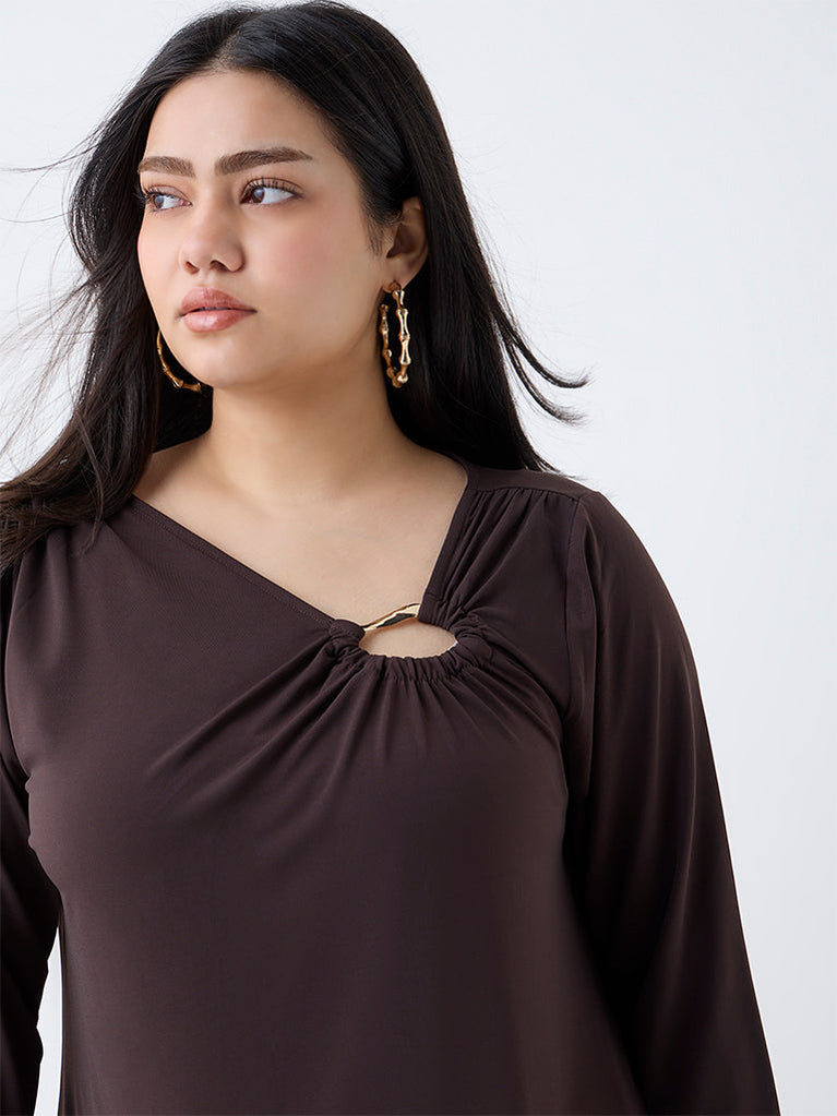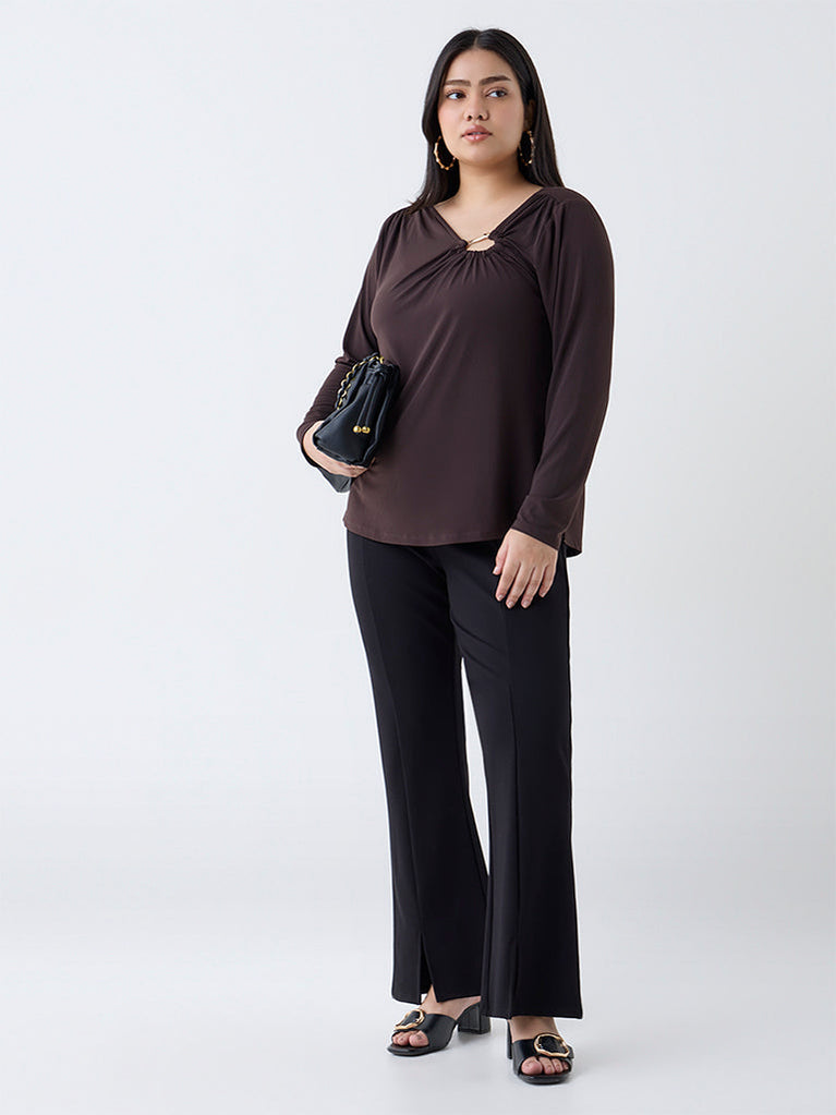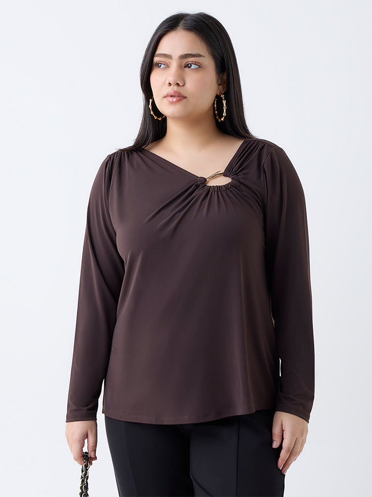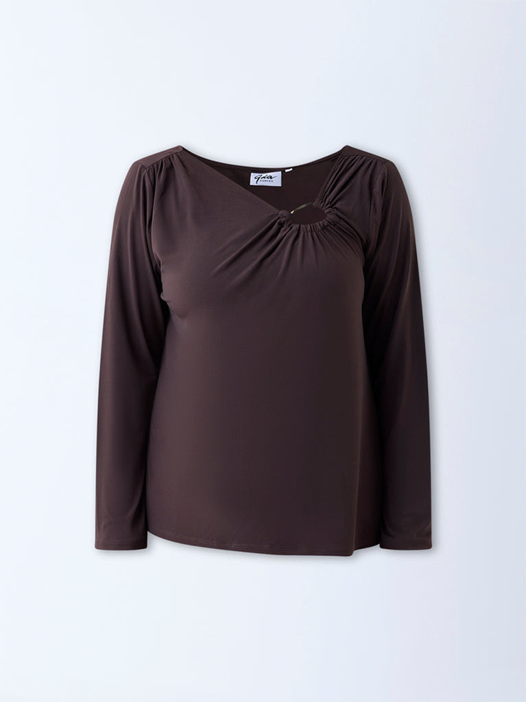 A refined addition to your wardrobe, this dark brown top by Gia is crafted from a stretch-infused fabric that ensures all-day comfort. Designed with a gold-toned hardware and subtle ruching, it lends a touch of sophistication. The full sleeves complete the elegant silhouette, perfect for both work and evening wear.