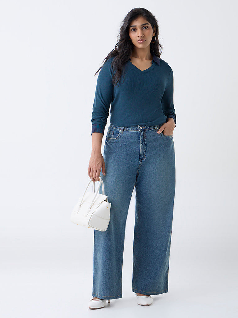 Gia elevates everyday dressing with this dark teal top featuring a refined ribbed texture. Designed with a V-neck and full sleeves, it includes a contrasting collar that adds a sharp accent. Woven from premium-blend fabric, it delivers structure and comfort in equal measure.