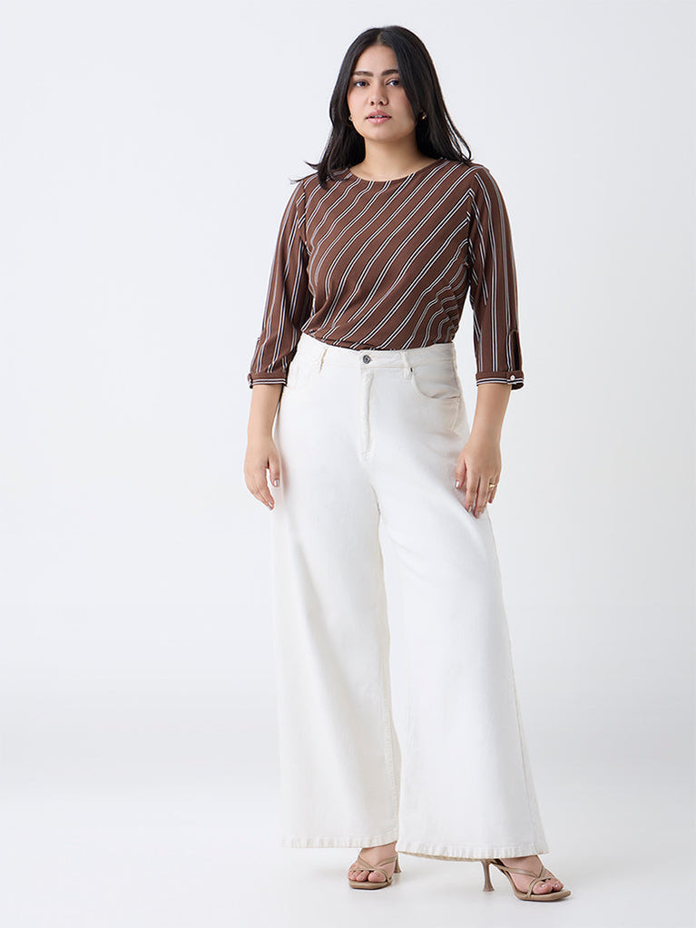 Gia updates everyday essentials with this dark brown top, accented with elongating vertical stripes for a flattering finish. Milled from a lightweight fabric, it features a round neckline and three-quarter sleeves that balance comfort with a casual charm.