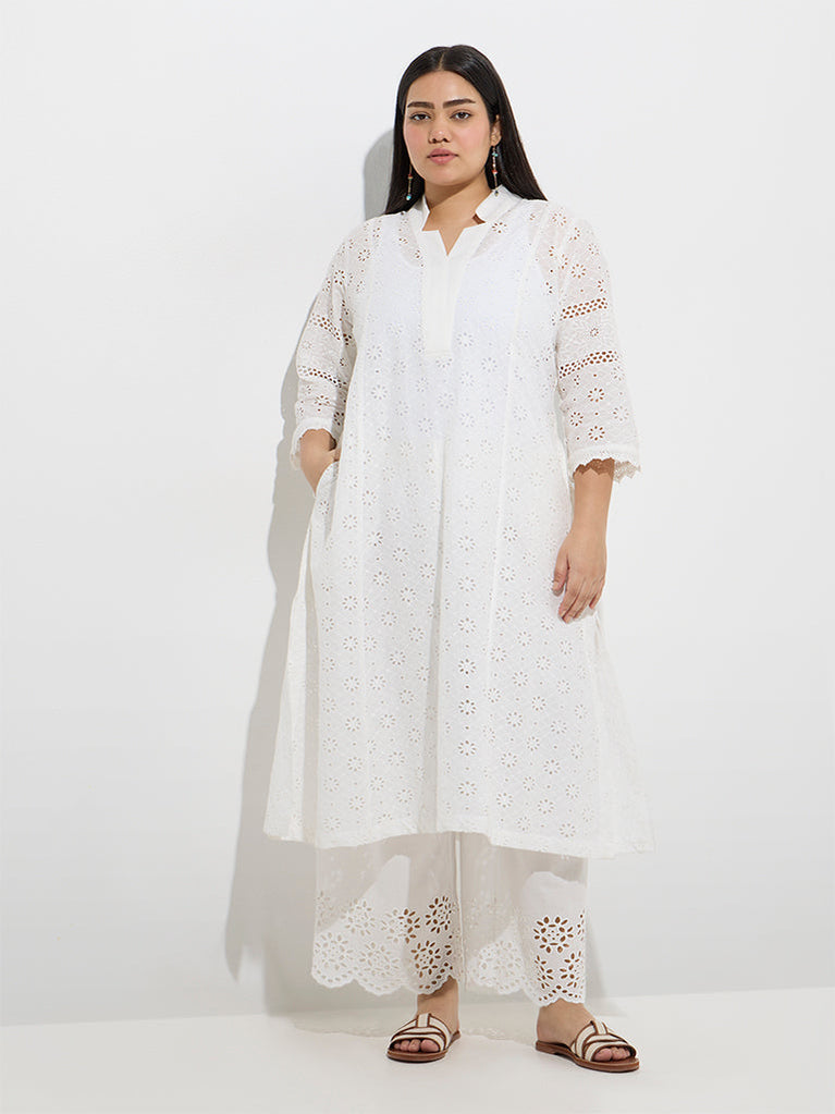 Diza White Schiffli Embroidered A-Line Cotton Kurta