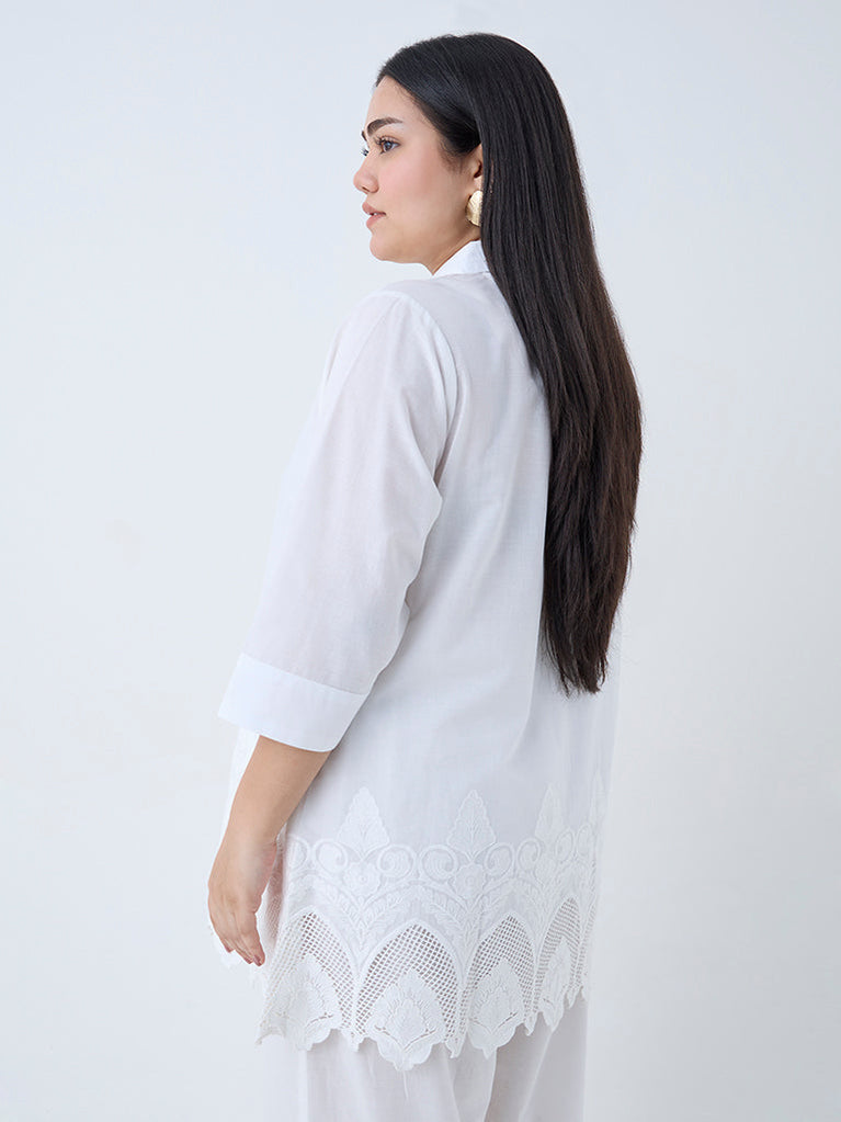 This white kurta from Diza showcases intricate schiffli embroidery across a graceful A-line silhouette. Spun from pure cotton, it features a crisp collar, a neat button placket, and three-quarter sleeves for a refined finish. Practicality meets style with a discreet slip pocket, making it an elegant yet functional addition to your wardrobe.