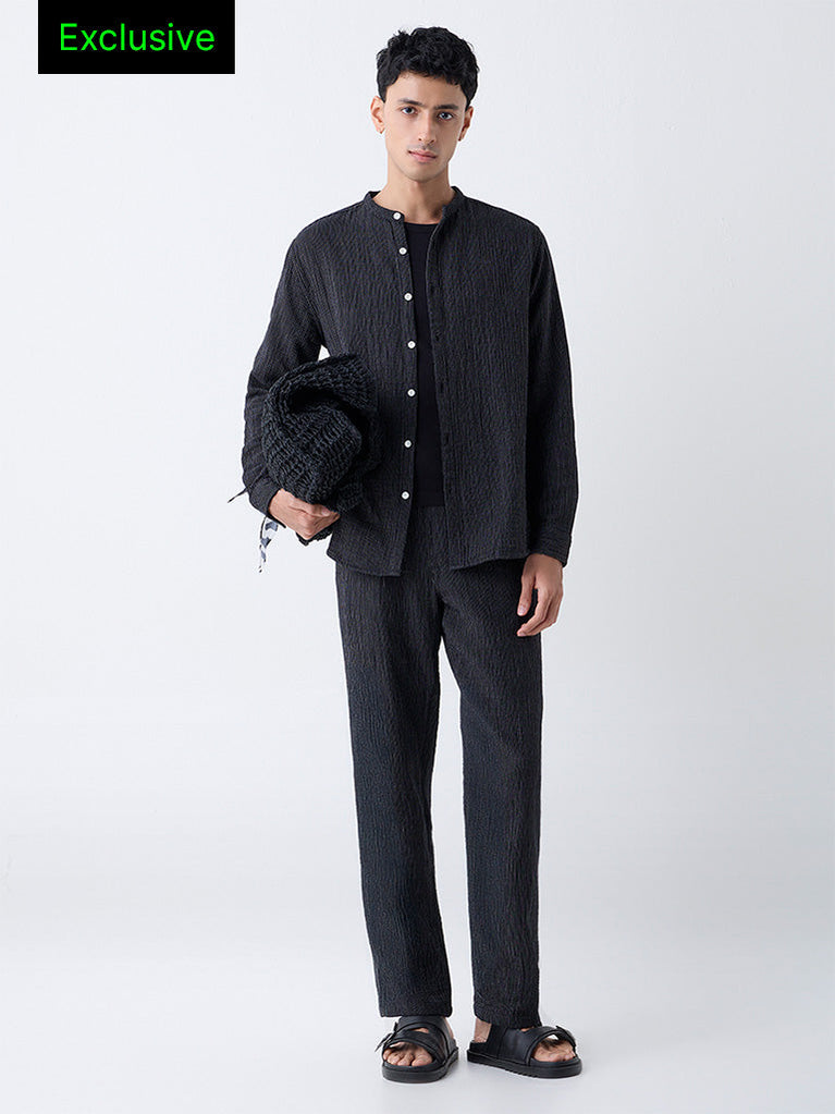Make a subtle statement with this black shirt from ETA. Adorned with embroidered motifs on a textured base, it is crafted from pure cotton for a soft, comfortable feel. Designed in a relaxed silhouette with a crisp collar, full sleeves and a button-up front, it serves as an effortless addition to everyday wardrobes.
