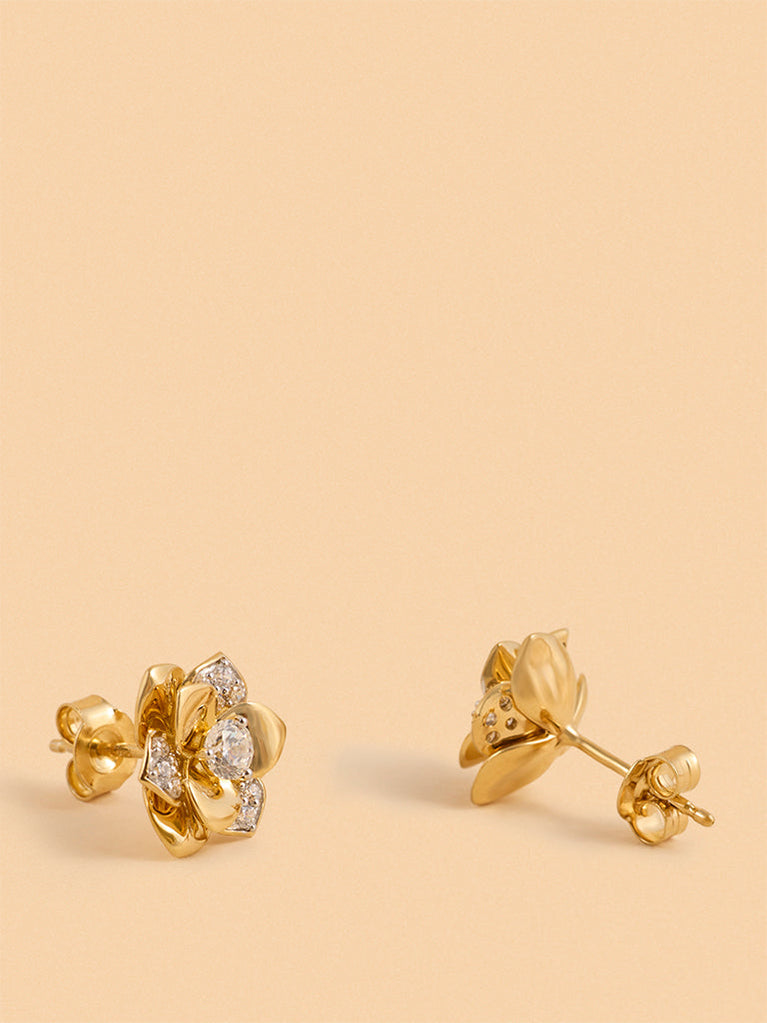 These gold-tone floral solitaire earrings from Westside X Pome are crafted with a polished finish. Each earring showcases a delicate floral motif centered around a single clear stone, designed in a petal-inspired silhouette. The post-back closure ensures a secure and comfortable fit, making this a timeless accessory.
