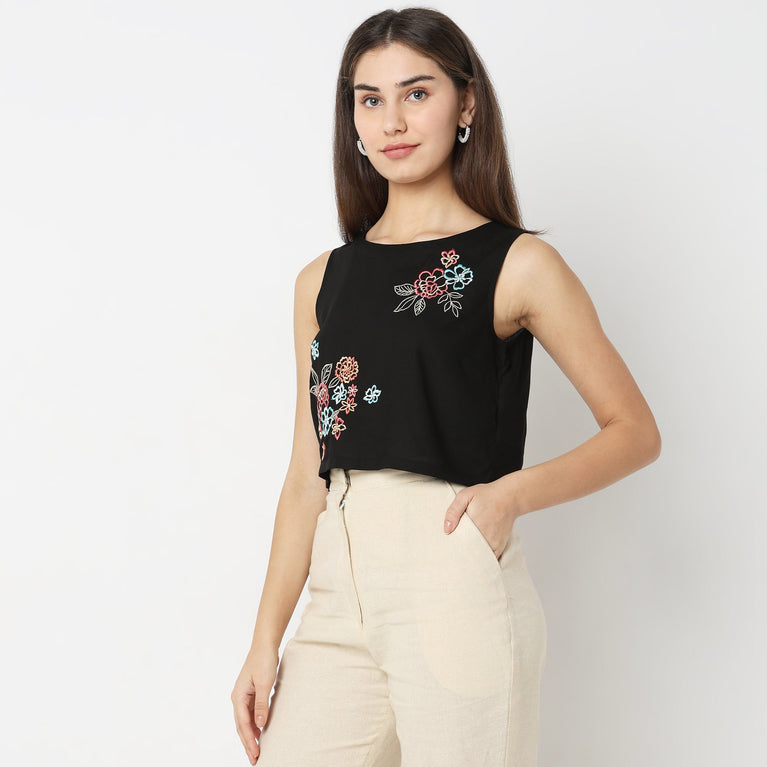 This midnight blossom theme, embroidered pattern top has a round neck and is sleeveless. Made from viscose, it is soft and comfortable to wear.