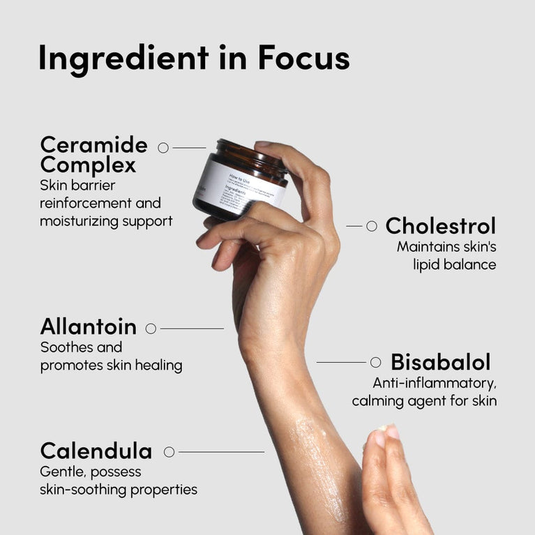 Cera Alba(Beeswax), Calendula Officinalis (Sunflower Oil), Persea Gratissima Oil(Avocado Oil), Simmondsia Chinensis (Jojoba Oil), Theobroma Cacao Seed Butter(Cocoa butter), Tocopherol Acetate, Ceramide EOP (and) Ceramide NS (and) Ceramide NP (and) Ceramide AS (and) Ceramide AP (and) Cholesterol (and) Hydrogenated Lecithin (and) Glyceryl Stearate (and) 2,3-Butanediol, Allantoin, Bisabolol