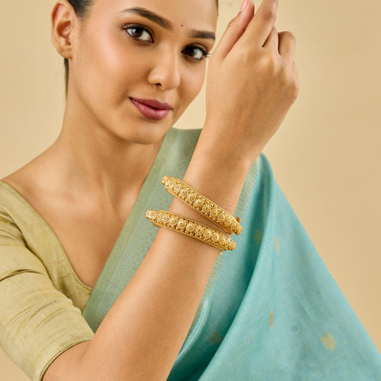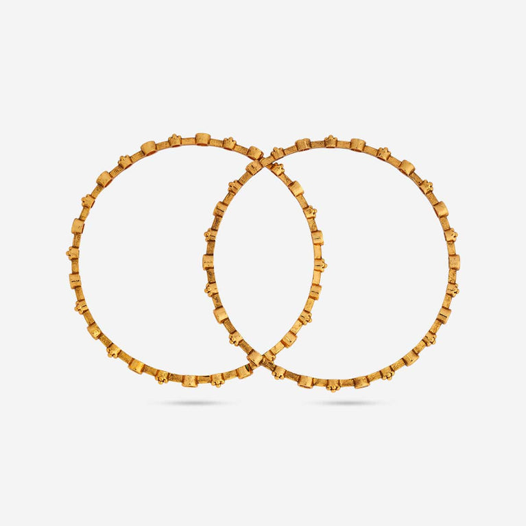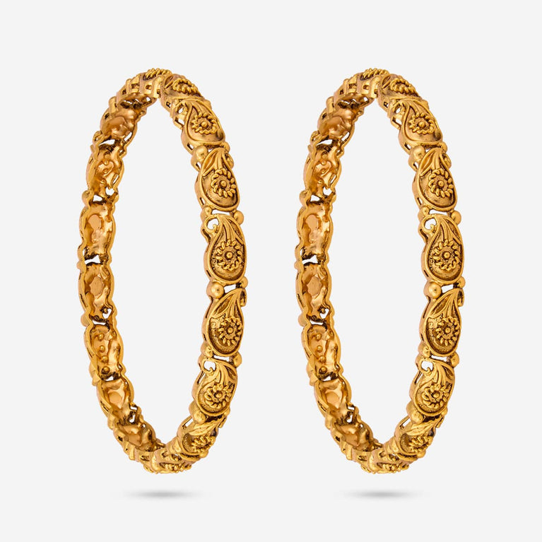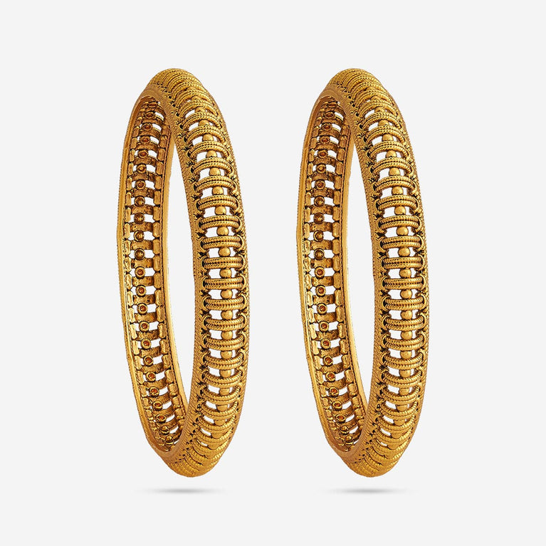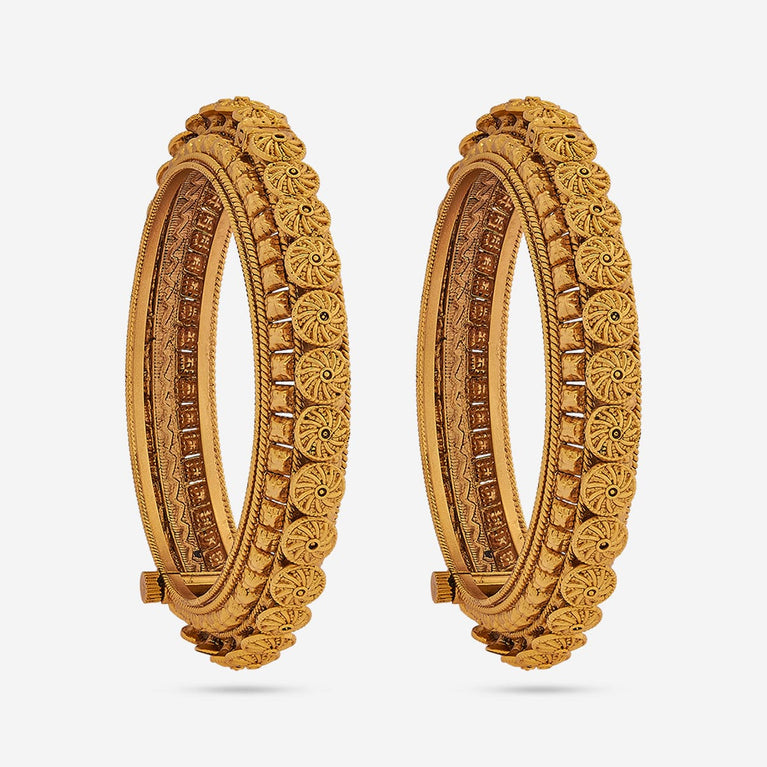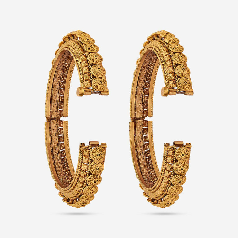 Traditional Design Antique BangleEmbrace the main character's energy with these antique bangles. Set in a rich gold tone polish, these bangles are the epitome of simplicity and festiveness in harmony. Pair with an anarkali for a Bollywood movie kind of look, or pair with evergreen sarees for a traditional look.