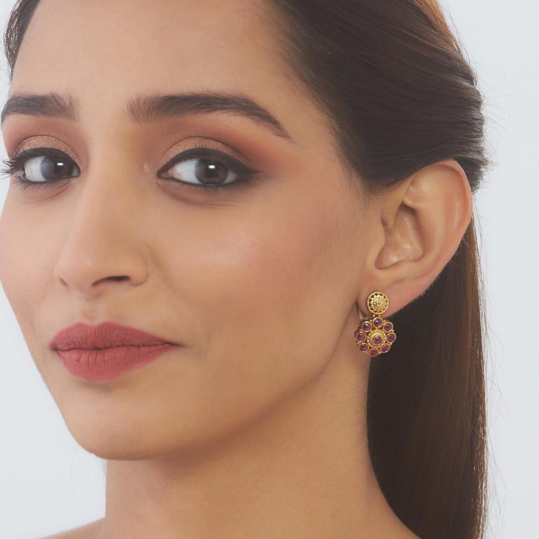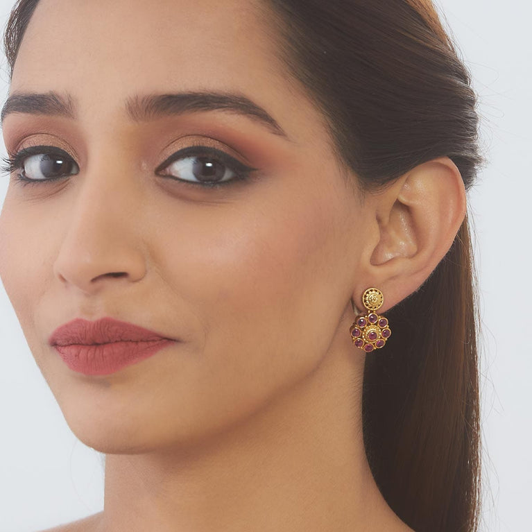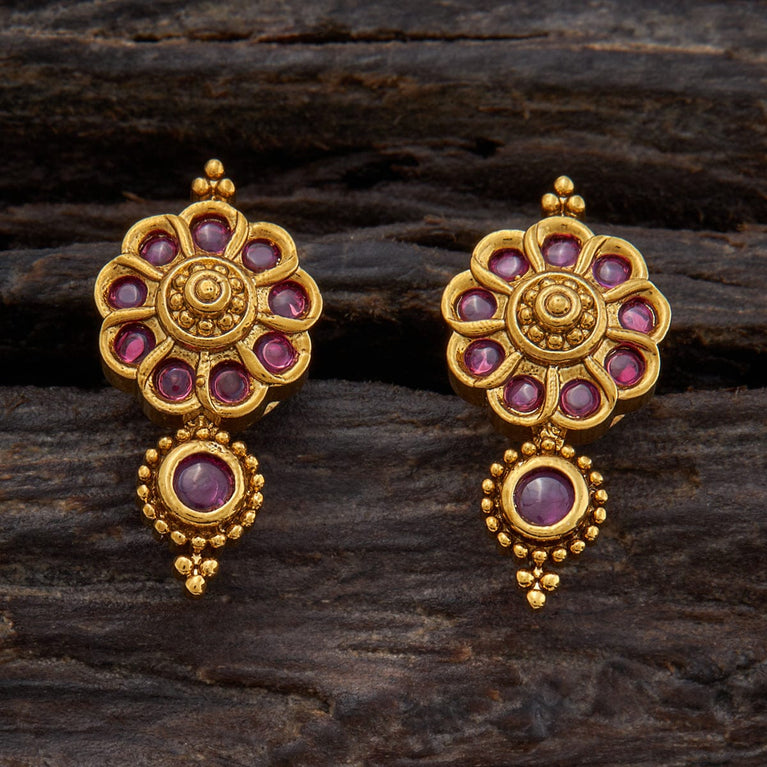 Kushal's Ruby Antique EarringFor a truly eye-catching accessory, try our antique ruby stud earring! Handcrafted with precision using synthetic stones and beads, this piece boasts a beautiful flower-like appearance. Its unique design and gorgeous ruby colour make it perfect for any occasion.