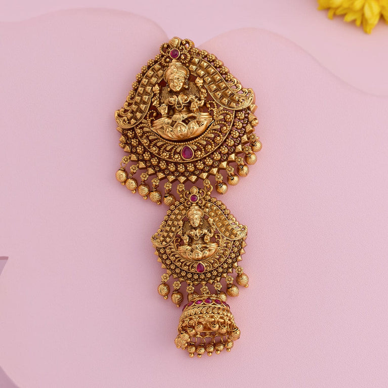 Antique hair clip big size lakshmi design with kemp stones and pearl hangings