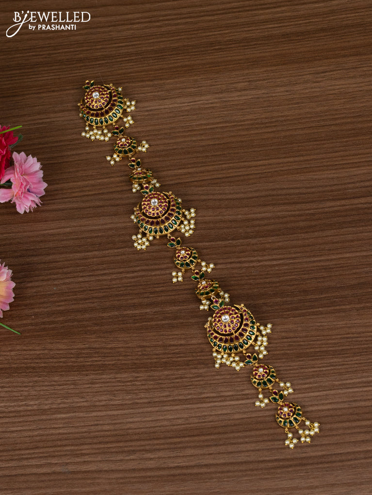 Antique hip chain with emerald & kundan stones and pearl hangings