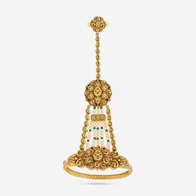 Antique jada billai chandbali style with kemp stones and pearl hangings