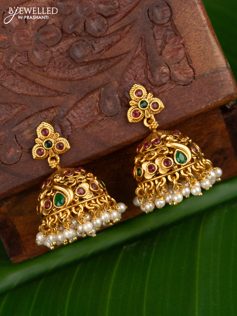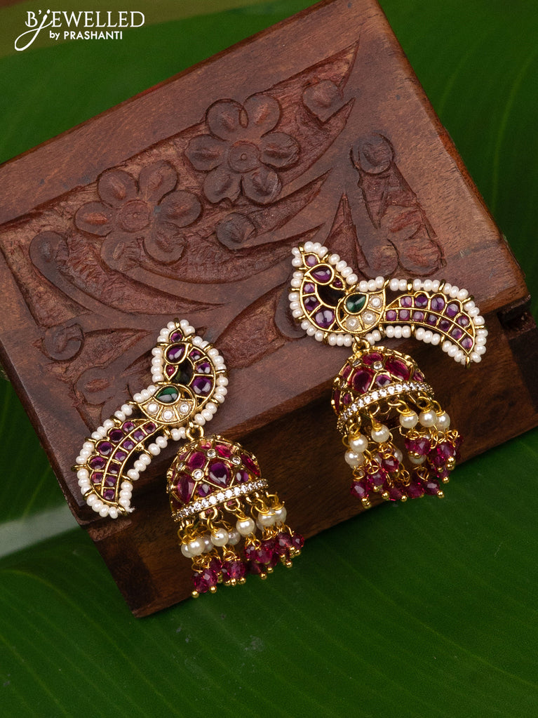 Antique jhumka peacock design with kemp stones and pearl hangings