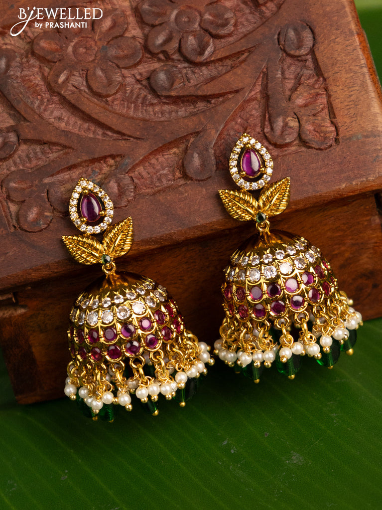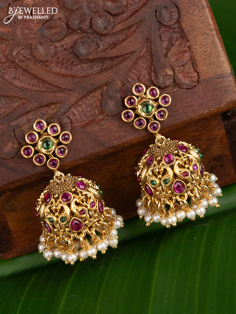 Antique jhumka with kemp & cz stones and pearl & beads hanging