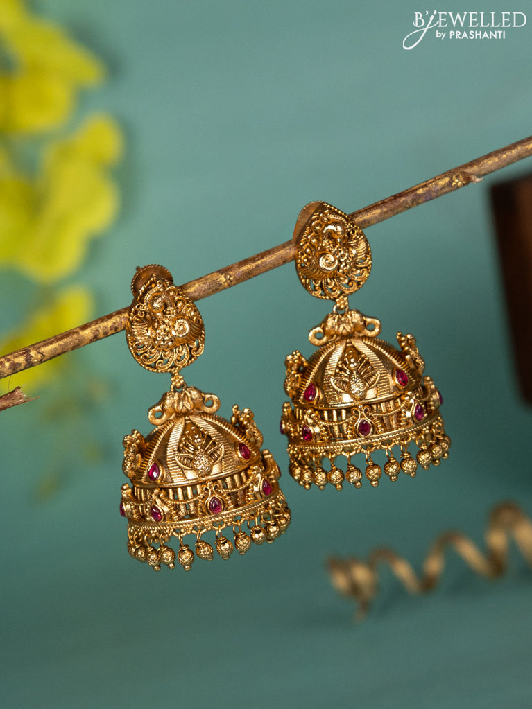 Antique jhumka peacock design with pink kemp stones and golden beads hanging