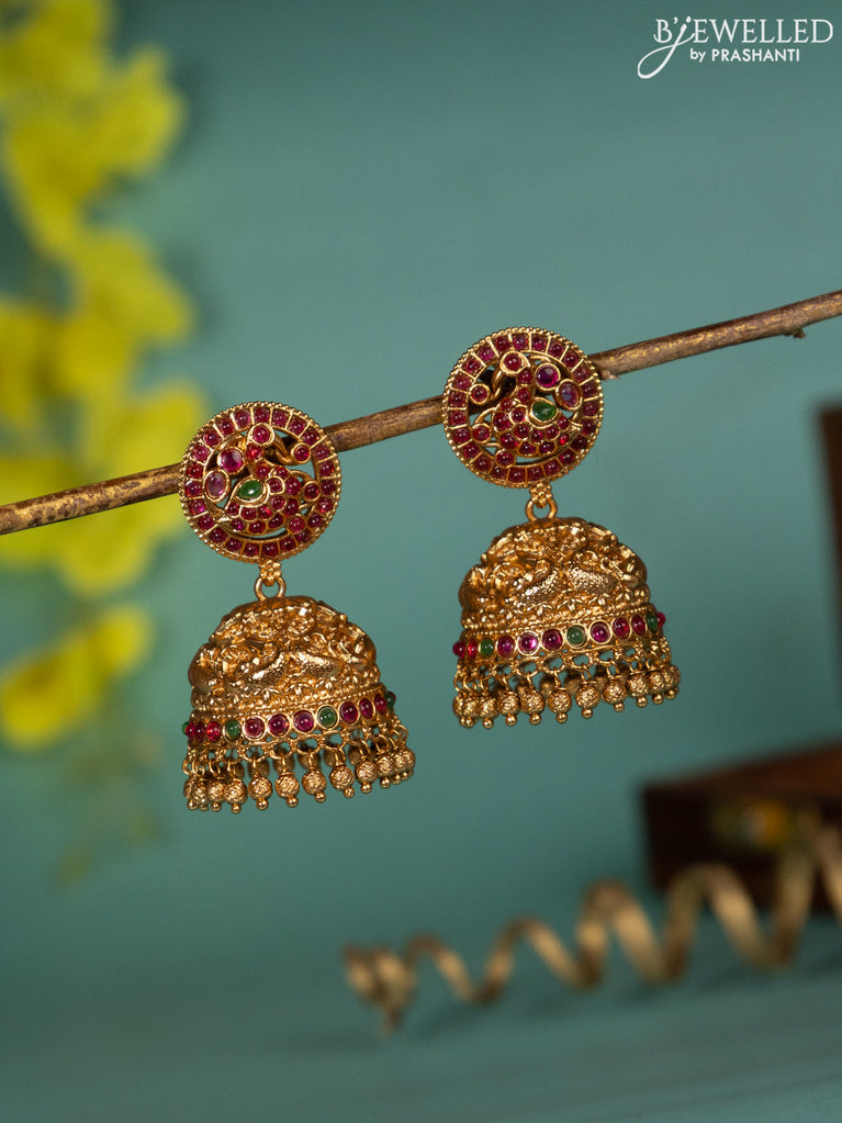 Antique jhumka peacock design with kemp stones and golden beads hanging