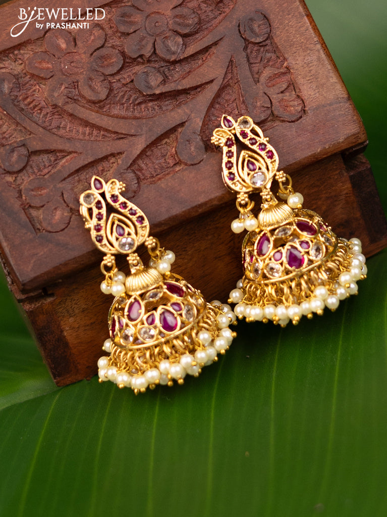 Antique jhumka with pink jadau kundan stones and pearl & beads hanging