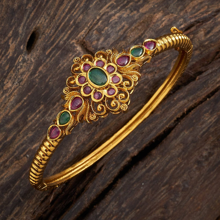 Kushal's Fashion Jewellery Flower Motif Antique KadaYou need a magnificent wrist accessory to blend in with your eye-catching necklaces and earrings, and our latest antique Kada is the perfect option. The ruby and ruby-green stones adorn the gold polish on this Kada, making it the best accessory for traditional and fancy occasions. Trust this Kada to be your source of confidence and praise.