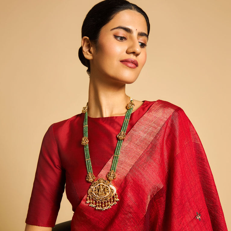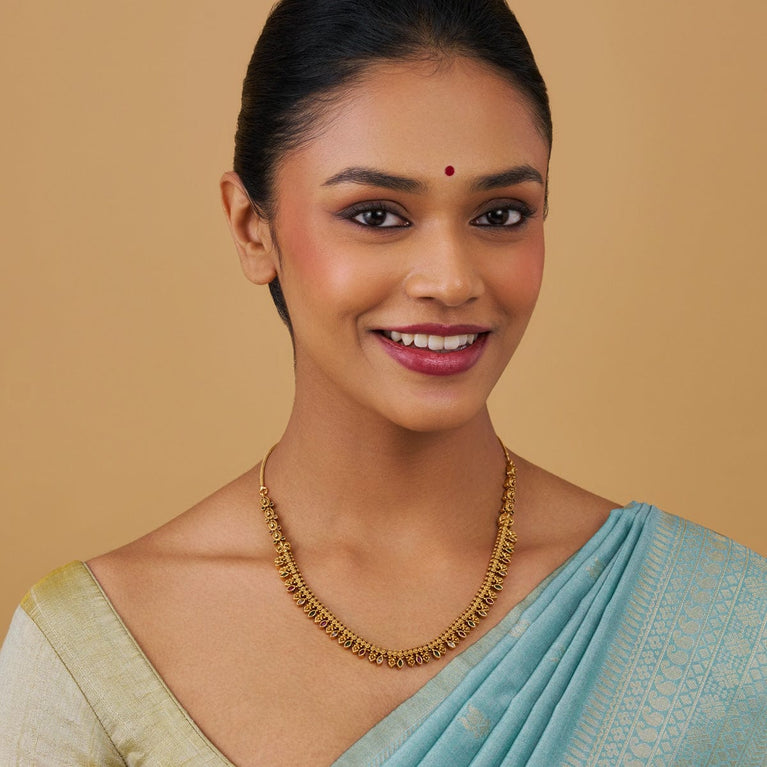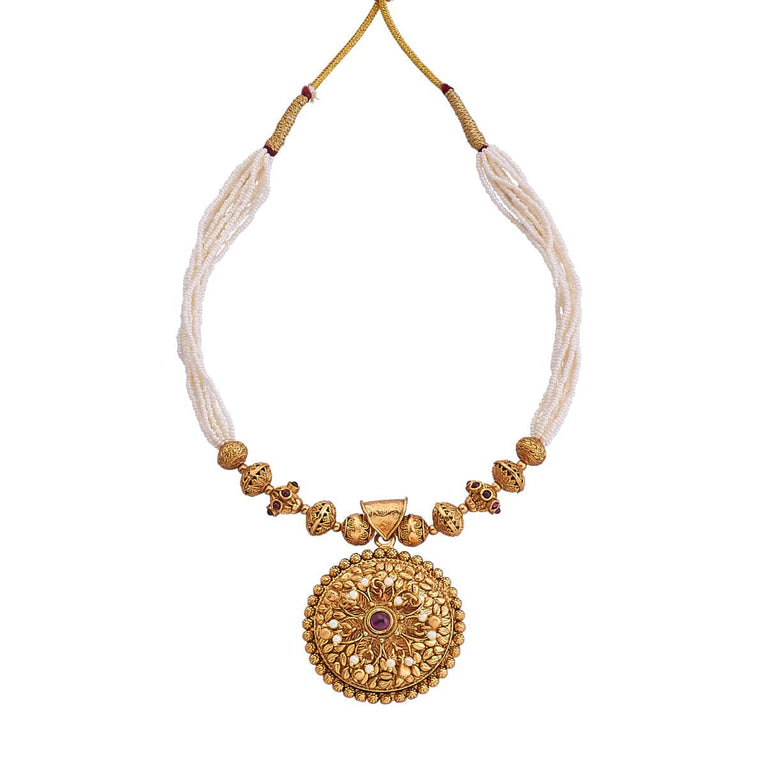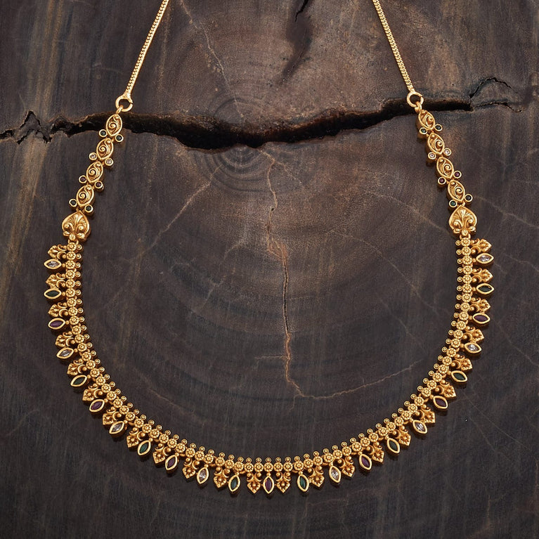 Kushal's Fashion Jewellery Antique NecklaceJewellery is the favorite element among women, boosting your looks and self-assurance. Antique jewellery has become a trend lately. Make your impression long-lasting with this ancient and classic piece of antique necklace. This piece is intricately designed, gold-polished and studded with ruby stones, demonstrating a masterpiece of the vintage era.
