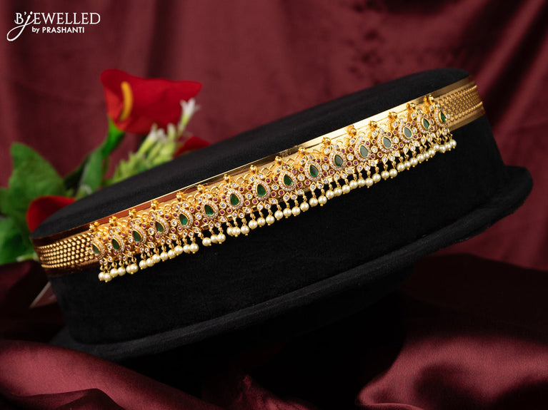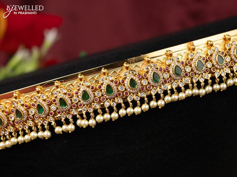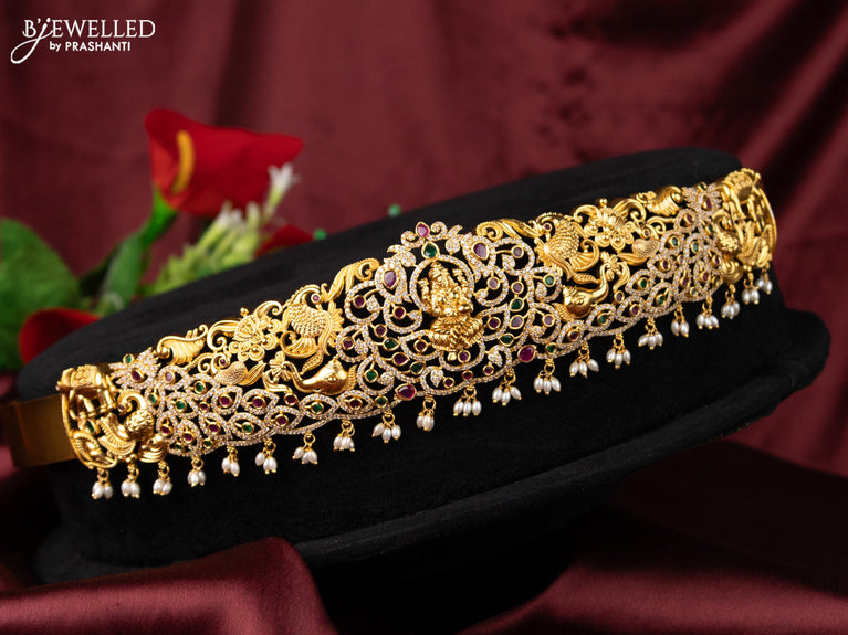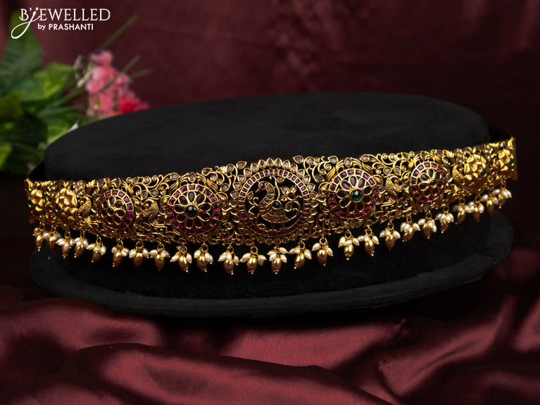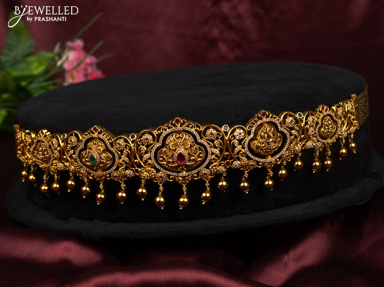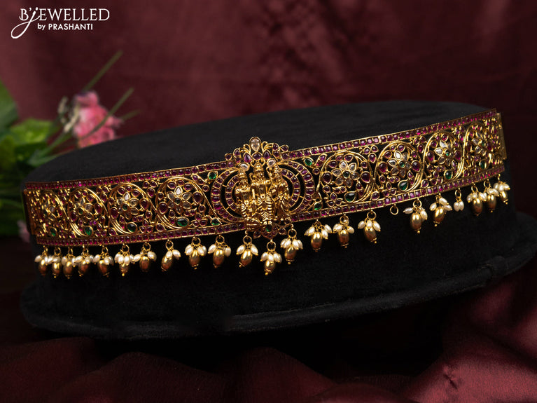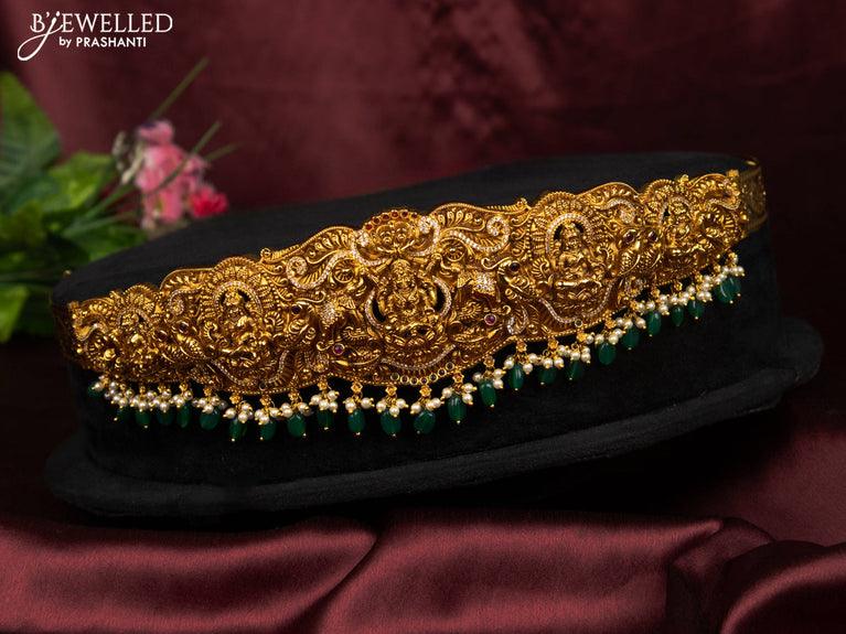 Antique self embosse hip belt lakshmi design with kemp & cz stones and pearl hangings