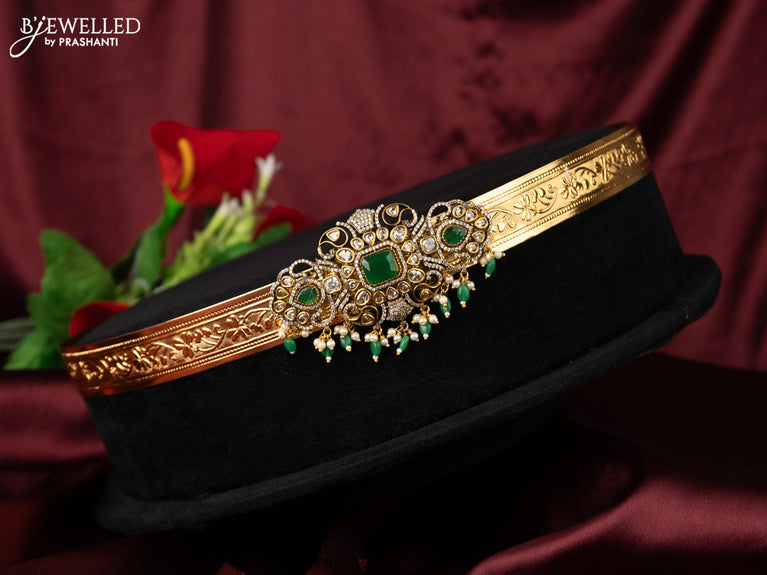Antique self embosse hip belt floral design with green kemp & cz stones and pearl hangings