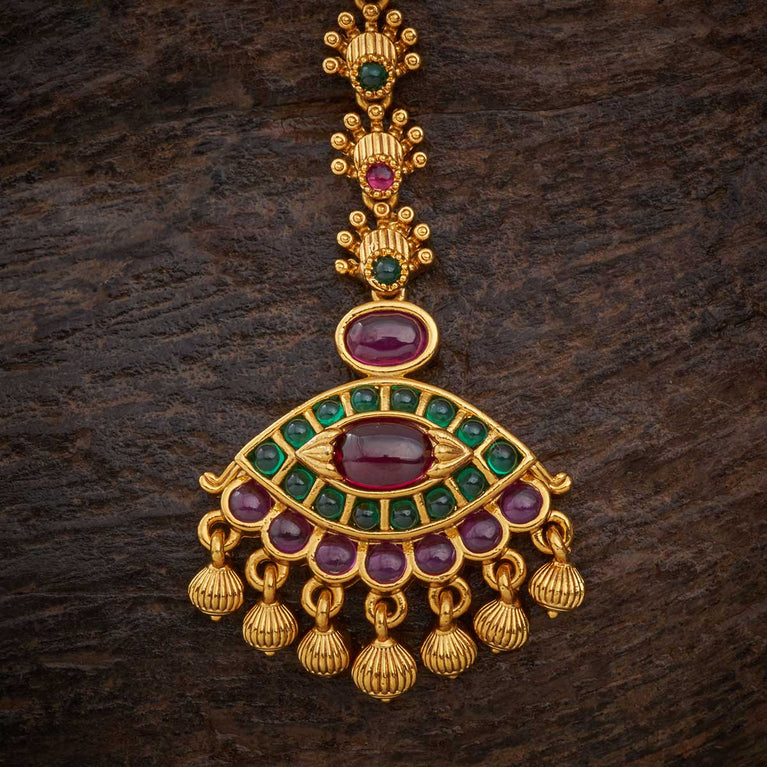 Kushal's Fashion Jewellery Antique TikkaA magnificent Tikka can make your outfit go from bland to eye-catching, which is why we present our latest antique Tikka. The best part of this Tikka is the gold polish that compliments the shine of the ruby, green, and ruby-green stones used in it. Wear it with your favourite outfit.