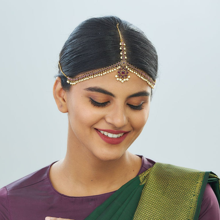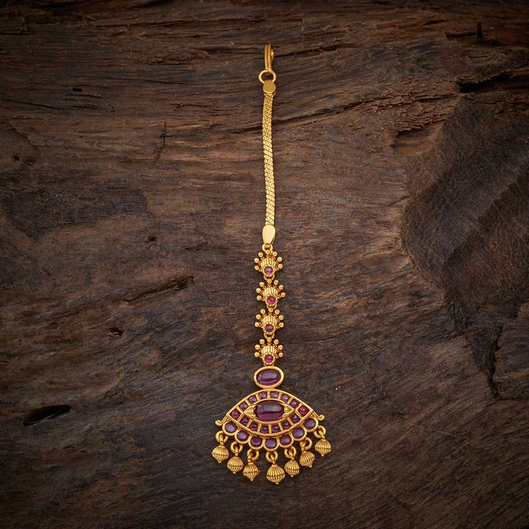 Kushal's Fashion Jewellery Flower Motif Antique TikkaMaang tikka, made for the perfect bling, was developed for today's society. A maang tikka is perfect for every occasion and comes in various colors to suit your unique preferences. This maang tikka is constructed of ruby-green, green and ruby beads, and artificial stones, giving you a festive look. It has a floral motif with rubies incorporated in it.
