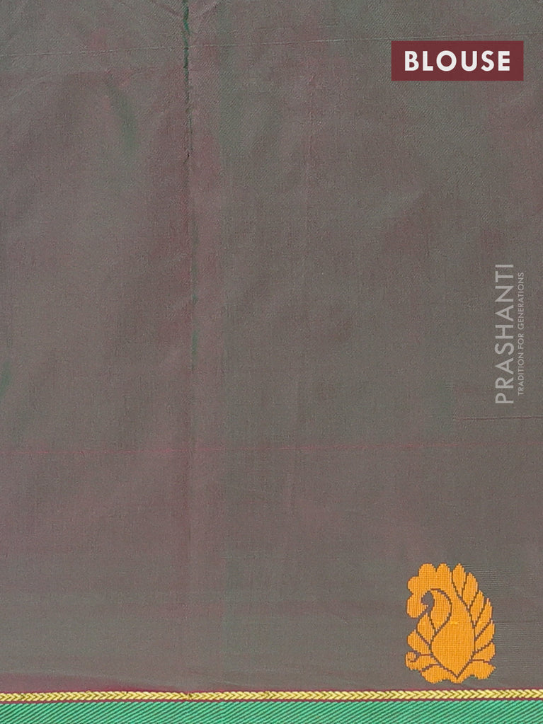 Arani semi silk saree deep purple and green mustard yellow with plain body and temple design border
